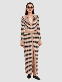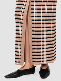 The Check Wool & Silk Skirt is a straight fit knitted skirt, crafted from a luxurious blend of merino wool and silk. This ribbed style is soft and fluid. It features a central buttoned closure, and is finished in a modern check pattern with chain stitch detailing. - Designed for a straight fit - Mid-rise - Central buttoned closure - Elasticated waistband - Product code: jf0089431915 - Blusher Combo Beige SIZE ADVICE - Length 87cm - 89cm - Model wears size S CARE & MATERIALS Discover the Care Guide, a guide to help you to care for your garments. - 75% Merino wool 25% Silk - Machine wash, wool / silk program wash, very gentle spin - Do not bleach - Do not tumble dry - Iron low temperature setting - Dry clean - Use a wool shampoo - Wash inside out with similar colours - Dry flat - Iron inside out