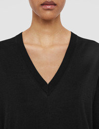 The Superfine Cotton Silk V Neck Jumper is a relaxed fit jumper, crafted from a fine silk and cotton blend. This style is lightweight and semi sheer, with a soft and luxurious look and feel. It's finished with knitted pointelle detailing down the centre back. - Designed for a relaxed fit - Semi sheer - Lightweight - Product code: jf0090150010 - Black SIZE ADVICE - Model wears size M CARE & MATERIALS Discover the Care Guide, a guide to help you to care for your garments. - 57% Silk 43% Cotton - Machine wash hand wash cycle, very gentle spin - Do not bleach - Do not tumble dry - Iron low temperature setting - Dry clean - Use a wool shampoo - Put in a laundry bag - Wash inside out with similar colours - Dry flat - Iron inside out