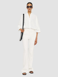 The Tafira Linen Stretch Trousers are a fit to flare trouser, crafted from a linen viscose blend. These trousers are a mid-weight linen with stretch, while retaining the natural breathability and drape of linen. Ideal for warm weather suiting, these trousers deliver optimum comfort and a flattering silhouette. - Fit to flare - Mid-rise - Full-length - Side pockets - Product code: jp0017410045 - Ivory SIZE ADVICE - Regular outer leg length 113cm - 116cm - Shorter outer leg length 102cm - 105cm - Model wears size FR 36/UK 8/EU 34/US 4/DE 34/IT 40/JP 7 CARE & MATERIALS - 57% Linen 40% Viscose 3% Elastane - Do not wash - Do not bleach - Do not tumble dry - Iron low temperature setting - Dry clean