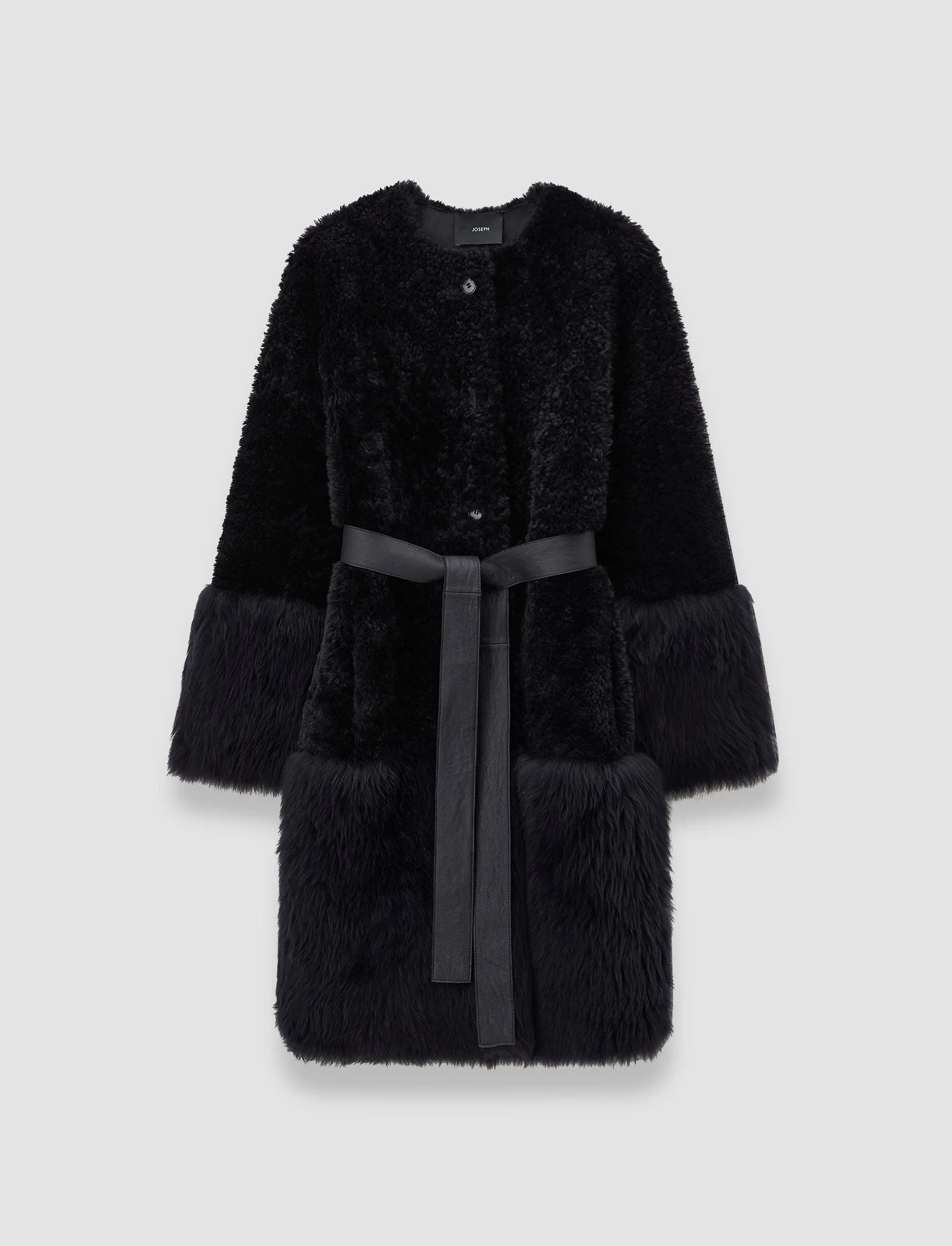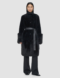 The Tina Shearling Coat is a regular fit coat, crafted from 100% shearling. Offering a luxurious, tactile experience, this coats expertly blends two shearling textures: short-curly and a long fur variety. It's classic cut and collarless design ensures comfort and room for layering over your favourite knitwear. Model wears size FR 38/UK 10/EU 36/US 6/DE 36/IT 42/JP 9 Details - Designed for a regular fit - Button fasten - Mid-length - Collarless - Leather inside - Statement long fur cuffs and hem - Side pockets - Removable belt - Product code: jf0094690261 Care & Materials - 100% Sheepskin - Do not wash - Do not bleach - Do not iron - Do not tumble dry - Do not dry clean - Cleaning by a leather specialist only