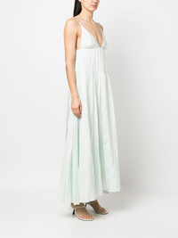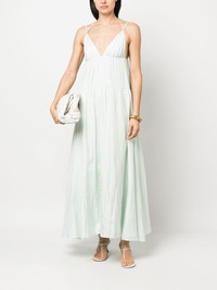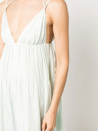 V-neck spaghetti-strap dress light green silk panelled design V-neck spaghetti straps long length Imported Composition Silk 100% SIZE & FIT Model measurements Height 5 ft 11 in(1.8 m) Bust/Chest 33.07 in(84 cm) Hips 37.4 in(95 cm) Waist 25.19 in(64 cm) Measurement LENGTH 55.51 in(141 cm) WAIST 35.43 in(90 cm) HIPS 40.94 in(104 cm) FittingInformation Designed for a close fit at the chest with a loose fit over the waist and hips Made from a lightweight non-stretch fabric This piece fits true to size – take your usual size