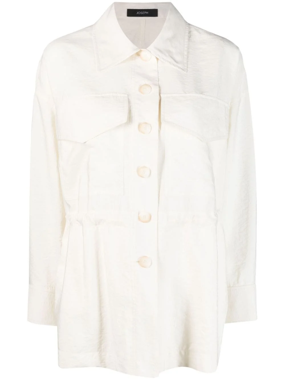 Welbeck drawstring shirt jacket Spun from a smooth silk blend composition exclusive to JOSEPH, this Welbeck shirt jacket achieves a premium feel defined by its minimalist ivory tone and cinched drawstring waist. Highlights - Ivory white - Silk blend - Classic collar - Front button fastening - Two chest flap pockets - Drawstring waist - Long sleeves - Buttoned cuffs - Curved hem Imported Composition Outer: Silk 82%, Polyamide 18% Lining: Polyester 100% SIZE & FIT Model measurements Height 5 ft 10 in(1.78 m) Bust/Chest 31.49 in(80 cm) Hips 36.22 in(92 cm) Waist 25.59 in(65 cm) Measurement SLEEVE LENGTH 18.5 in(47 cm) LENGTH 28.74 in(73 cm) FittingInformation Designed to be unstructured, offering a loose fit throughout The adjustable drawstring means that you can adjust this piece’s fit to suit your comfort and preference Made from a midweight non-stretch fabric This piece fits true to size – take your usual size