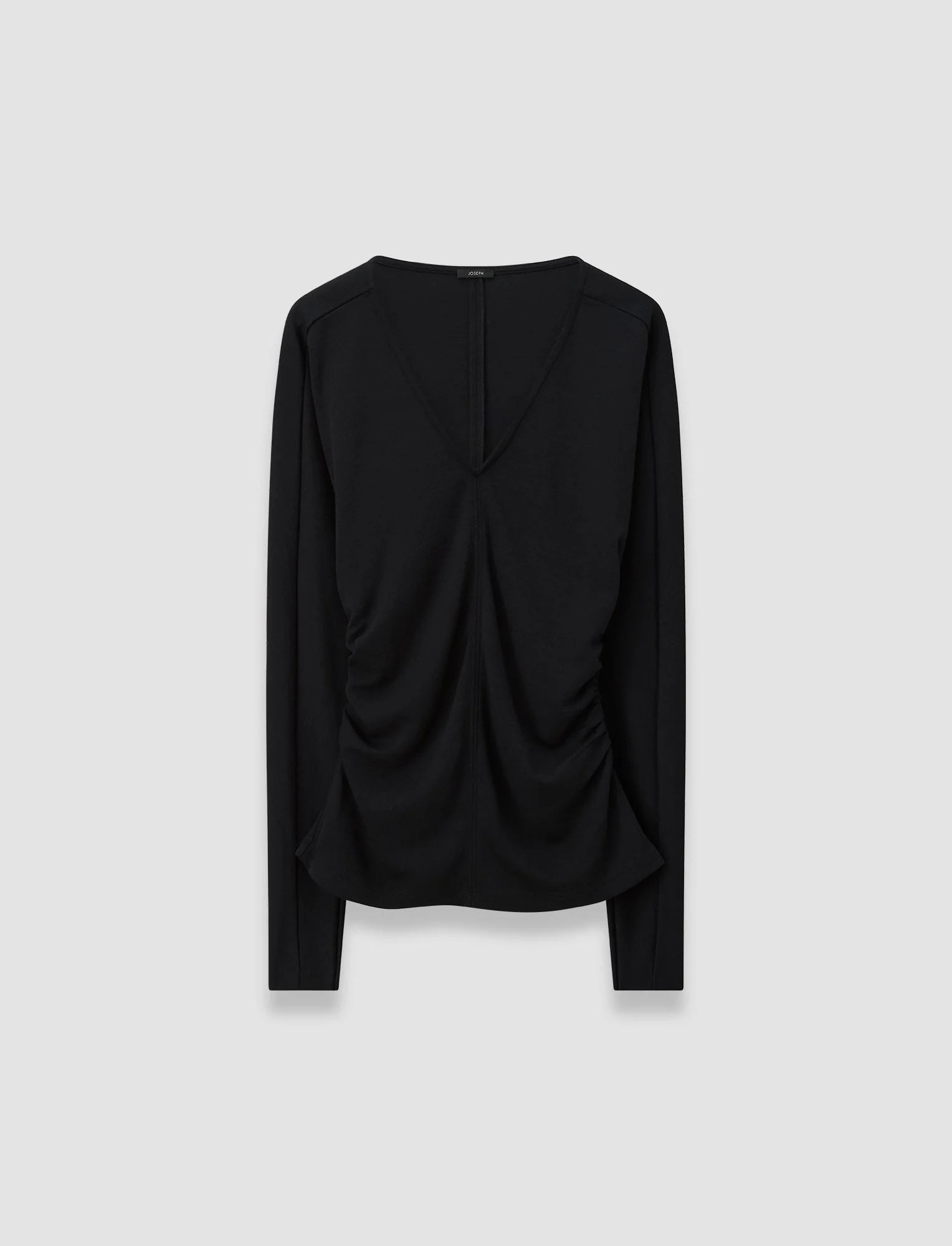 The Wool Jersey V Neck Top is a slim fit style, crafted from a wool blend. This top has a soft hand feel and features ruched sides for an elegant look. Model wears size S Details - Designed for a slim fit - Ruched sides and cuffs - Product code: jf0093390010 Care & Materials - 80% Polyester 20% Wool - Delicate machine wash at 30 degrees - Wash inside out - Do not bleach - Do not tumble dry - Iron low temperature setting - Do not dry clean - Wash with similar colours