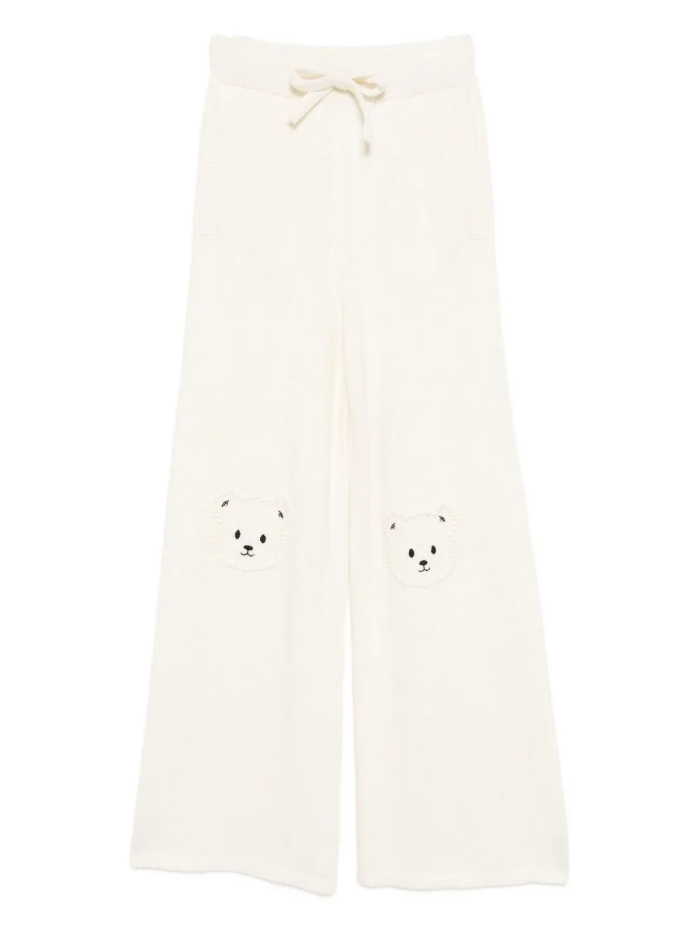 teddy-embellished knitted trousers Highlights - Cream - Elasticated drawstring waistband - Two side welt pockets - Rear patch pocket Made in Italy Composition Merino 40%, Viscose 30%, Polyamide 20%, Cashmere 10% Washing instructions Hand Wash