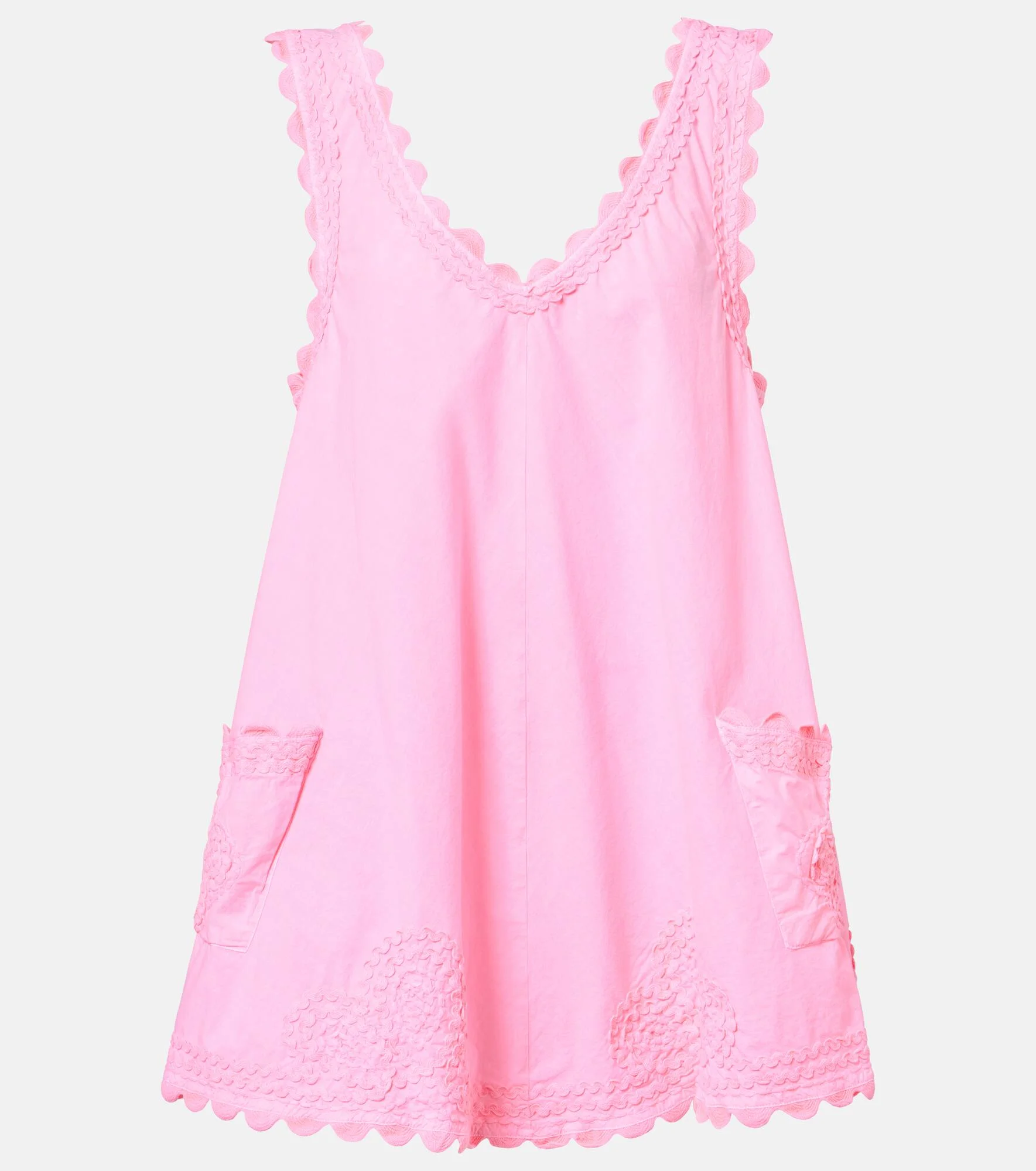 London-based designer Juliet Dunn employs Indian artisans to apply traditional techniques such as block printing, mirror work, and embroidery to her designs. This breezy minidress is cut from cotton poplin and features richly embroidered trims. Product Details - Material: 100% cotton - Care instructions: machine wash at 30 degrees - Made in India - Designer color name: Flamingo - Item color: pink - Pockets: patch pockets - Hem: scalloped - Item number: P01123054 Size & Fit - True to size - One size: perfect fit for sizes XXS - L - Low back - Designed for a loose fit - Non-stretchy fabric - One size