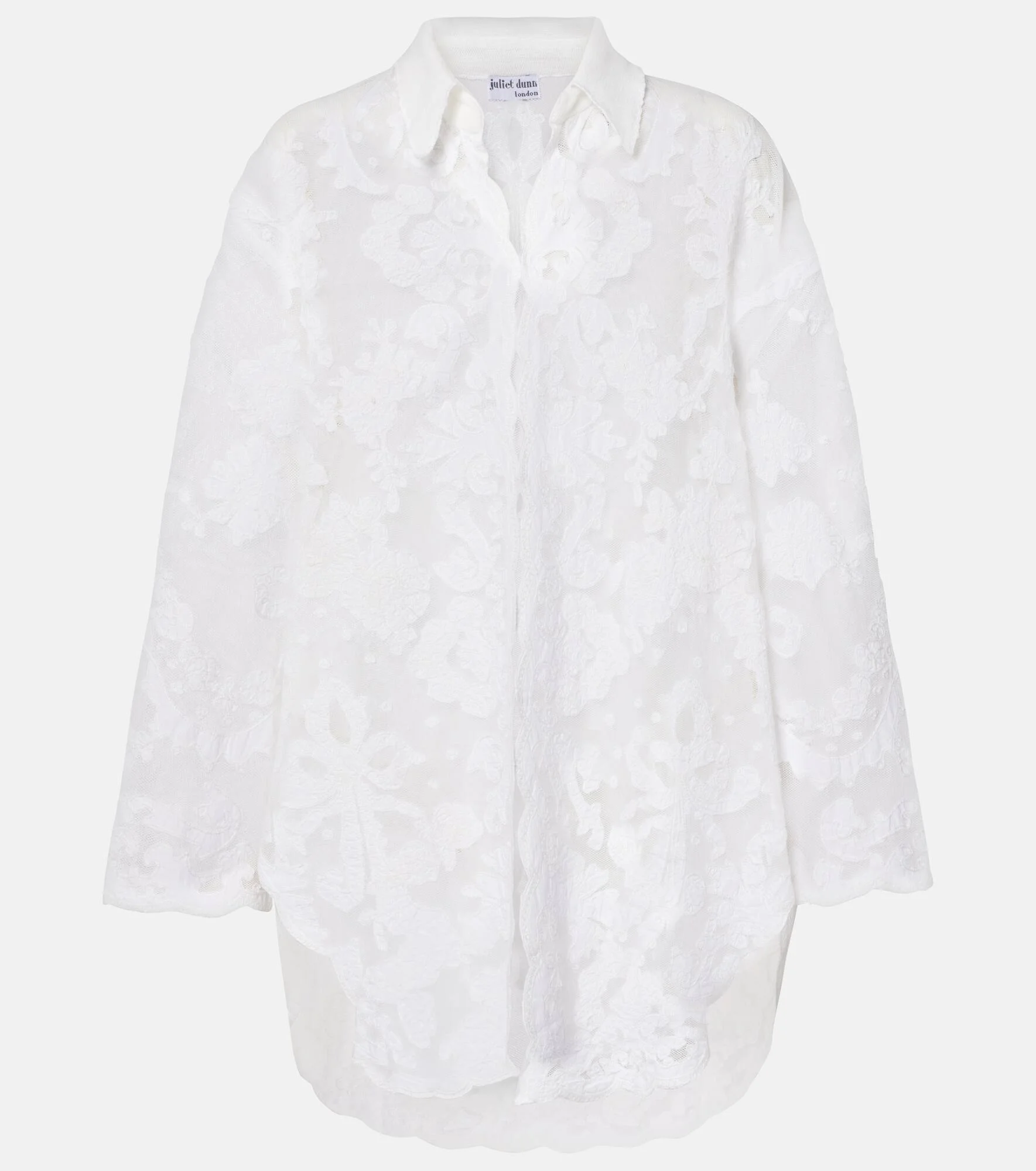 London-based designer Juliet Dunn employs Indian artisans to apply traditional techniques such as block printing, mirror work, and embroidery to her designs. This shirt is crafted from semi-sheer cotton and complete with lace-inspired detailing. Product Details - Material: 100% cotton - Care instructions: hand wash cold - Made in India - Designer color name: White - Item color: white - Collar: classic (Straight point) - Closure: hook-fastening front - Item number: P01123080 Size & Fit - True to size - Dropped shoulders - Semi-sheer - Oversized - Non-stretchy fabric - Falls below the hip - The model seen in the picture is 178cm-5'10" and wearing a size 0