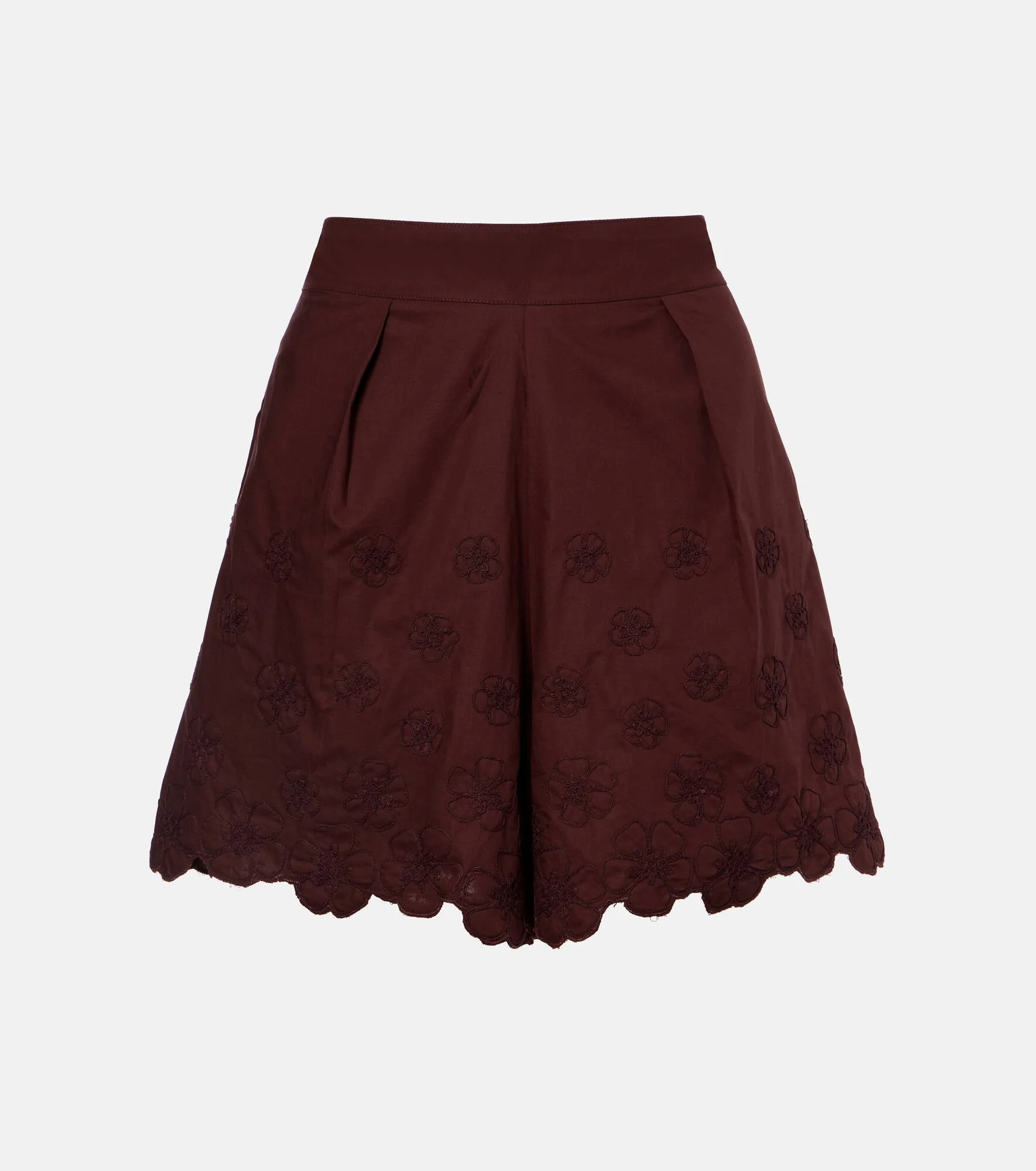 London-based designer Juliet Dunn employs Indian artisans to apply traditional techniques such as block printing, mirror work, and embroidery to her designs. These shorts are crafted from cotton poplin and are topped with embroidered floral details. Product Details - Material: 100% cotton - Care instructions: machine wash at 30 degrees - Made in India - Designer color name: Black Cherry - Item color: brown - Pockets: side slit pockets - Closure: concealed zipped back - Item number: P01123114 Size & Fit - True to size - Non-stretchy fabric - Wide-leg - High-waisted - The model seen in the picture is 178cm-5'10" and wearing a size 0