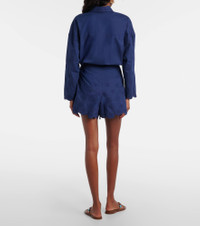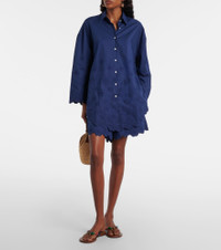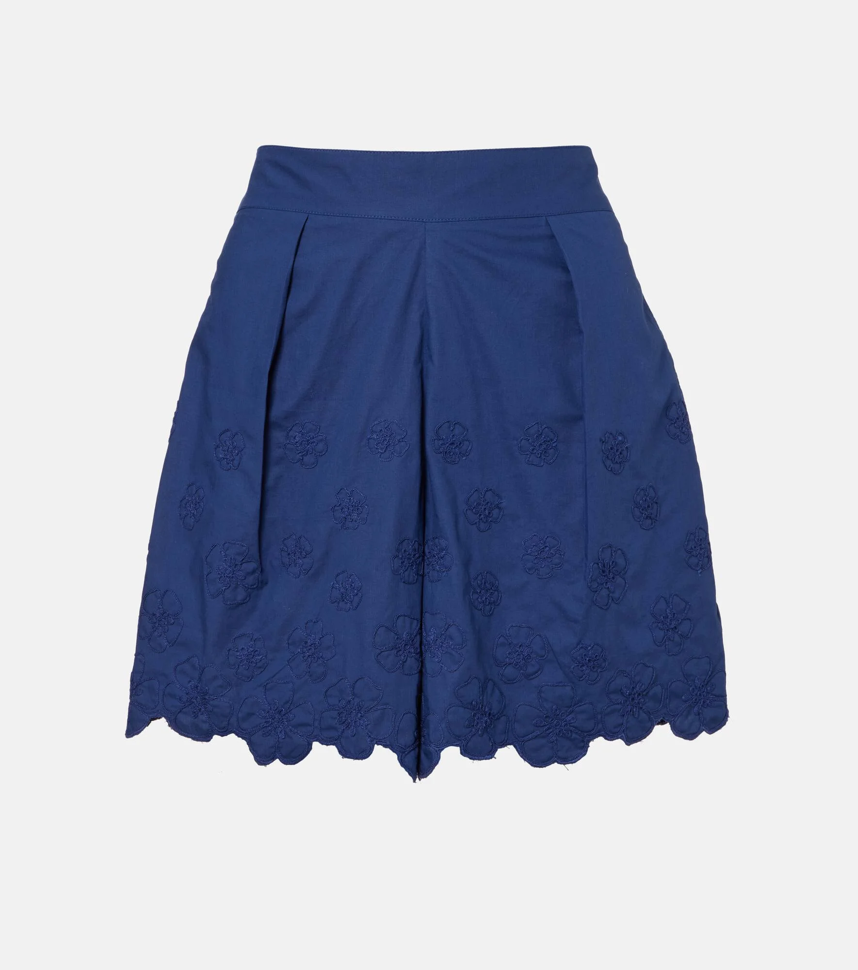London-based designer Juliet Dunn employs Indian artisans to apply traditional techniques such as block printing, mirror work, and embroidery to her designs. These shorts are crafted from cotton poplin and are topped with embroidered floral details. Product Details - Material: 100% cotton - Care instructions: machine wash at 30 degrees - Made in India - Designer color name: Navy - Item color: blue - Pockets: side slit pockets - Closure: concealed zipped back - Item number: P01123109 Size & Fit - True to size - Non-stretchy fabric - Wide-leg - High-waisted - The model seen in the picture is 178cm-5'10" and wearing a size 0