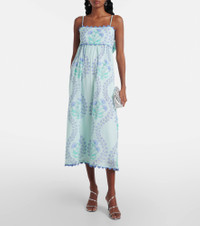 London-based designer Juliet Dunn employs Indian artisans to apply traditional techniques such as block printing, mirror work, and embroidery to her designs. This floral cotton midi dress is complete with a tie-back detail. Product Details - Material: 100% cotton - Care instructions: hand wash - Made in India - Designer color name: Aqua/Blue - Item color: blue - Closure: invisible zipper - Lining: 100% cotton - Item number: P01053474 Size & Fit - True to size - Low back - Cinched waist - Non-stretchy fabric - The model seen in the picture is 178cm-5'10" and wearing a size 1