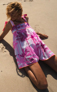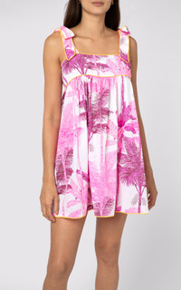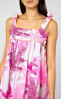 Pink Palm Print Tie Shoulder Baby Doll Dress with Neon Orange Piping PRODUCT DETAILS - As featured in the Resort '23 lookbook - Relaxed fit, shoulder ties, mini hem, lined - Concealed zip fastening - This style fits true to size, we suggest taking your normal size - Composition: 100% Organic Cotton - Hand wash in cold water - Made in India SIZE & FIT - This item fits true to size - Model is wearing size 1