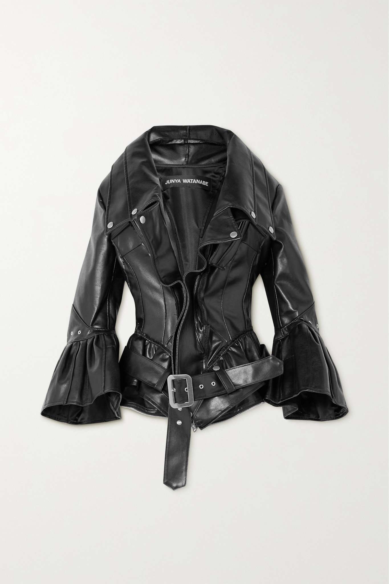 EDITORS'NOTES Junya Watanabe's biker jacket has a feminine, contoured shape evocative of 18th-century silhouettes. Constructed from panels of supple faux leather and trimmed with zips, it has voluminous bell sleeves, a Basque waist and a belted peplum hem. Style yours with distressed denim. SIZE & FIT - DETAILS & CARE - Black faux leather - Slips on - 100% polyurethane; lining: 100% polyester - Dry clean