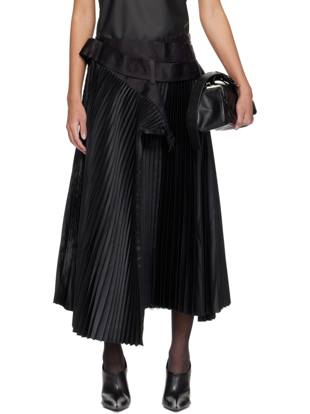 Garment-pleated polyester satin skirt. · Wrap construction · Belt loops · Integrated layered pin-buckle belts at waist · Concealed zip closure at back waist Supplier color: Black/Black