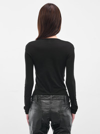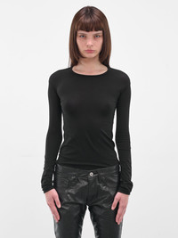 A black nylon t-shirt with a scoop neckline and slim cut. Long sleeves refine the stretch fit. Featuring: • Slim fit • Nylon construction • Scoop neck • Long sleeves • Made in Japan • 100% Nylon • Standard sizing Model is 5'7" wearing size S. Bust: 30" Waist: 22" Hips: 33"