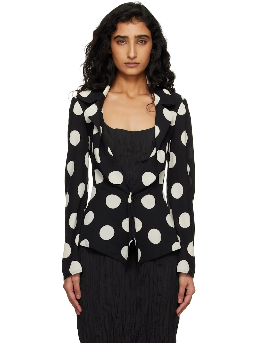 Lightweight georgette blazer. · Polka dot graphic printed throughout · Layered notched lapel · Button closure · Unlined Supplier color: Black/Off White 100% polyester. Made in Japan 261253F057000