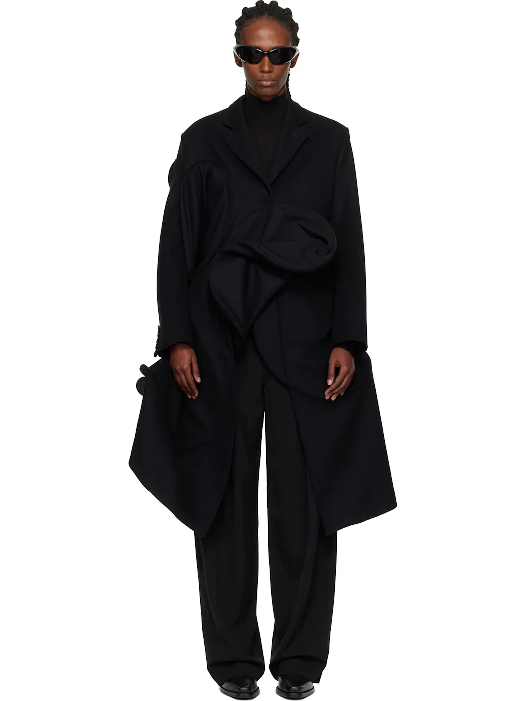 Heavyweight wool- and cashmere-blend melton coat. · Sculptural twill panels with flexible wire · Notched lapel · Single-button closure · Welt pockets at waist · Cutouts at sides and back · Mock surgeon's cuffs · Full satin and twill lining Supplier color: Black Body: 95% wool, 5% cashmere. Trim: 76% nylon, 24% polyurethane. Lining: 100% viscose. Made in Japan 252253F059000