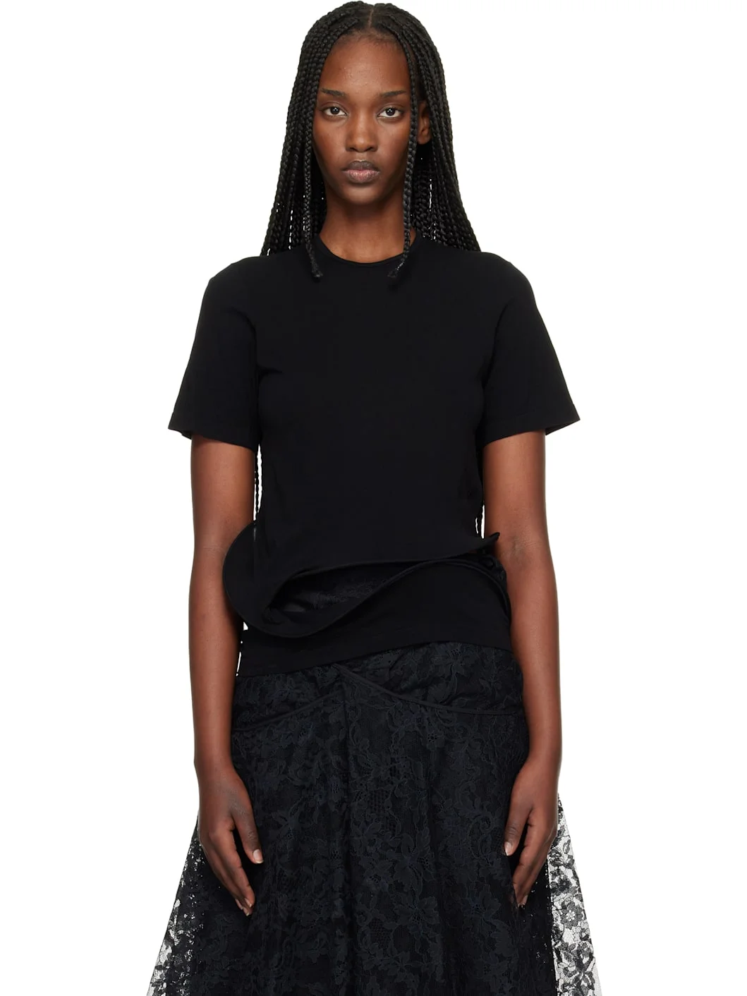 Semi-sheer nylon jersey T-shirt. · Crewneck · Integrated wire and cutouts at hem Supplier color: Black 100% nylon. Made in Japan 261253F110001