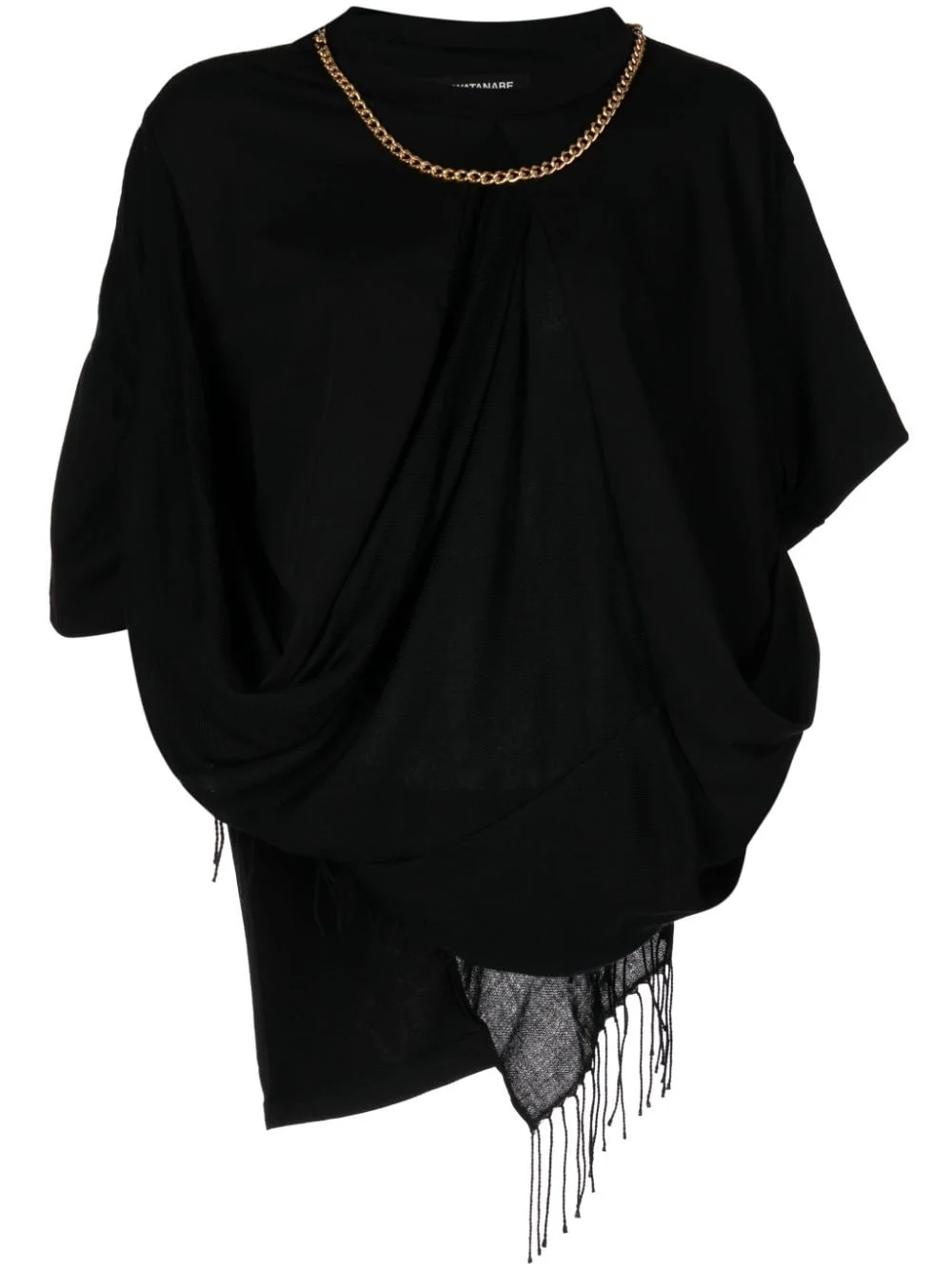 fringe-detail draped top Highlights - Black - Asymmetric design - Crew neck - Short sleeves - Fringed hem detail - Necklace detail Imported Composition Body: Wool 70%, Silk 30% Outer: Cotton 100% SIZE & FIT Model measurements Height 5 ft 10 in(1.78 m) Bust/Chest 29.13 in(74 cm) Hips 35.43 in(90 cm) Waist 23.62 in(60 cm) FittingInformation Designed to be unstructured, offering a loose fit throughout Made from a midweight non-stretch fabric, this piece offers minimal elasticity when worn This piece fits true to size – take your usual size Washing instructions Dry Clean Only