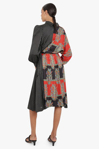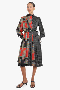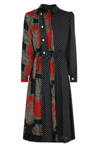 The Junya Watanabe Dress is a long-sleeved dress with layered detailing and button closure. It features a drawstring at the waist and is crafted in a contrast of polka dot and paisley pattern polyester satin fabric. Fabrication: 100% Polyester Size and Fit Nikita: Model is 174cm/5’7” and is wearing a size S Model Measurements: Bust: 30cm, Waist: 26.5cm, Hips 34cm This style fits true to size. Measurements Size S: Bust 96cm, Waist 86cm, Hip 114cm, Length 106cm