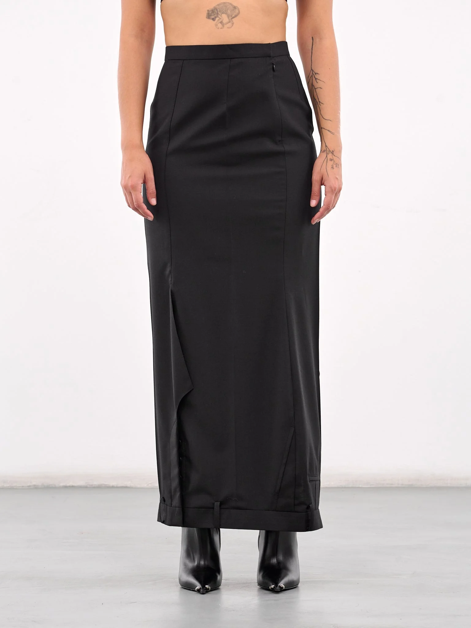 JUNYA WATANABE skirt in black, deconstructed trousers design, paneled construction, high waist, side concealed zip closure, waist darting, hem deconstructed trouser waistband embellishment, front & back vents, straight hem, maxi-length, fitted. Standard Sizing Model is 5'7" wearing size S. Bust: 34" Waist: 26" Hips: 34"