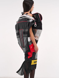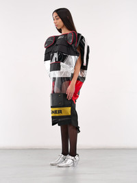 JUNYA WATANABE x DEGNER dress in black & silver, deconstructed sculptural design, paneled mixed-material construction, deconstructed bag detailing, transparent paneling, reflective paneling, wide neck, shoulder structuring, sleeveless, armscyes, piped detailing, metal studs, mesh paneling, flared hem, midi-length, oversized fit. Made in Japan Fabric 1: 100% Nylon Fabric 2: 100% Polyester Standard Sizing Model is 5'7" wearing size M. Bust: 32.5" Waist: 24" Hips: 32"