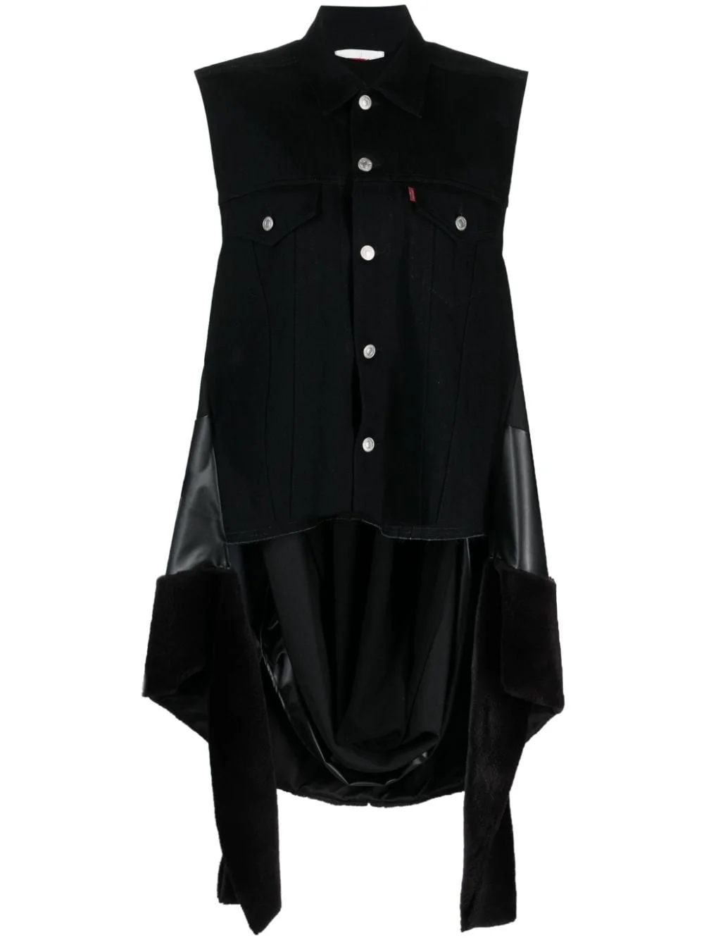 draped denim vest Junya Watanabe is renowned for experimental design and statement silhouettes. This cotton vest is defined by draped panels of wool and artificial leather, offering movement to the piece. Highlights - Black - Cotton/wool/artificial leather - Draped design - Classic collar - Front button fastening - Sleeveless Imported Composition Wool 100% SIZE & FIT Model measurements Height 5 ft 9 in(1.76 m) Bust/Chest 31.88 in(81 cm) Hips 35.43 in(90 cm) Waist 24.8 in(63 cm) FittingInformation Designed to be unstructured, offering a loose fit throughout Made from a midweight non-stretch fabric This piece fits true to size – take your usual size Washing instructions Dry Clean Only