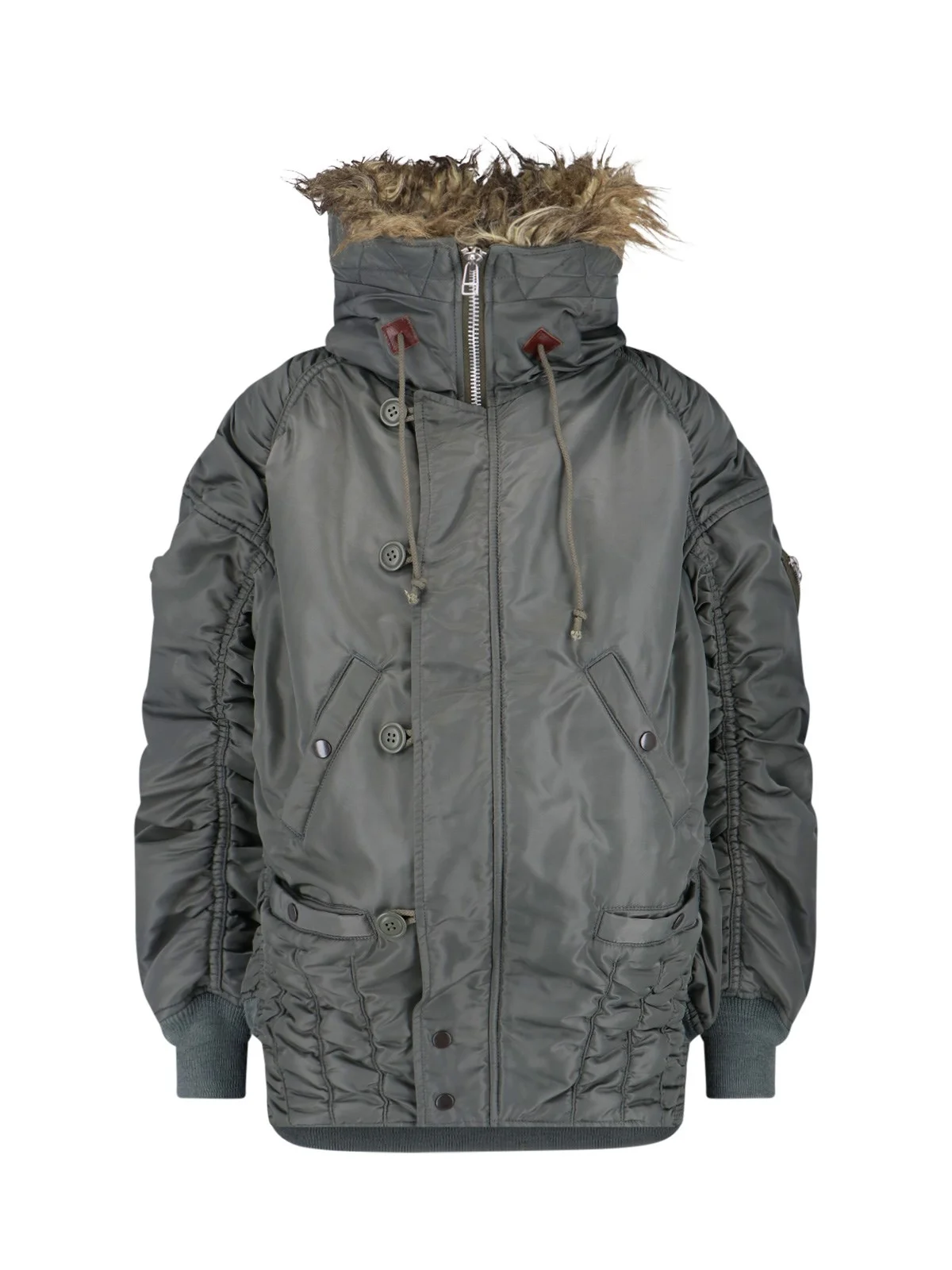 JUNYA WATANABE FAUX FUR JACKET IN GREEN NYLON WITH ADJUSTABLE ZIP AND BUTTON HOOD, HIGH NECK WITH DRAWSTRING, DROPPED SHOULDERS, BUTTON AND ZIP CLOSURE, ALL-OVER CURLED DETAILS, FOUR FRONT BUTTON POCKETS, ONE ZIP POCKET ON THE SLEEVE, BACK BAND, RIBBED TRIMS, STRAIGHT HEM. PRODUCT INFO PRODUCT CODE JP J017 W251 COMPOSITION: 100% NYLON SIZE AND FIT: SOFT FIT MADE IN: JAPAN - TRIMS: 100% LEATHER