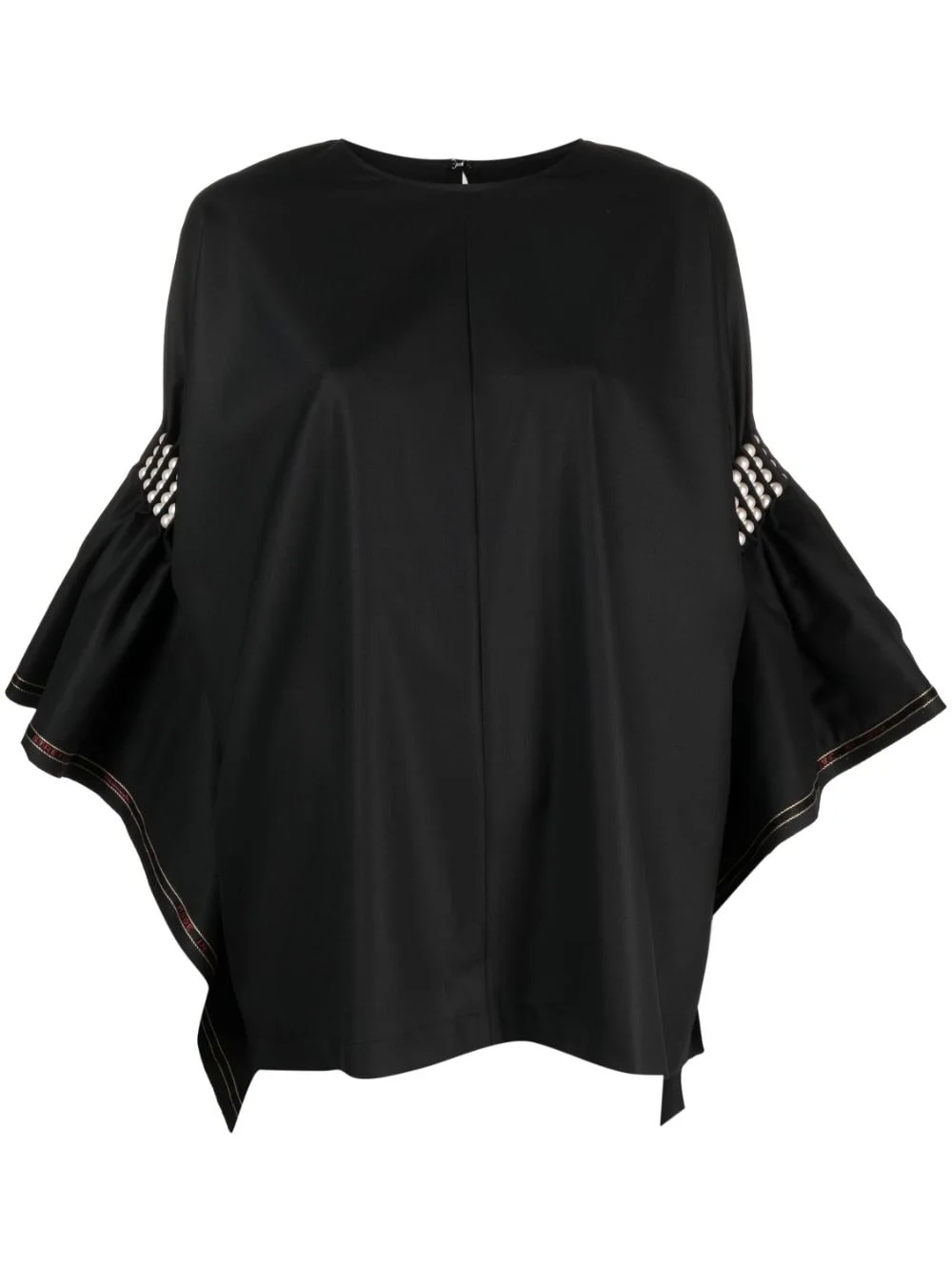 faux-pearl-embellished wool blouse Highlights - Black - Wool - Faux-pearl embellishment - Logo-embellished side panels - Round neck - Three-quarter length sleeves - Flared cuffs - Asymmetric hem Imported Composition Wool 100% SIZE & FIT Model measurements Height 5 ft 11 in(1.8 m) Bust/Chest 31.49 in(80 cm) Hips 36.22 in(92 cm) Waist 25.59 in(65 cm) FittingInformation Designed to be unstructured, offering a loose fit throughout Made from a midweight non-stretch fabric This piece fits true to size – take your usual size Washing instructions Dry Clean Only