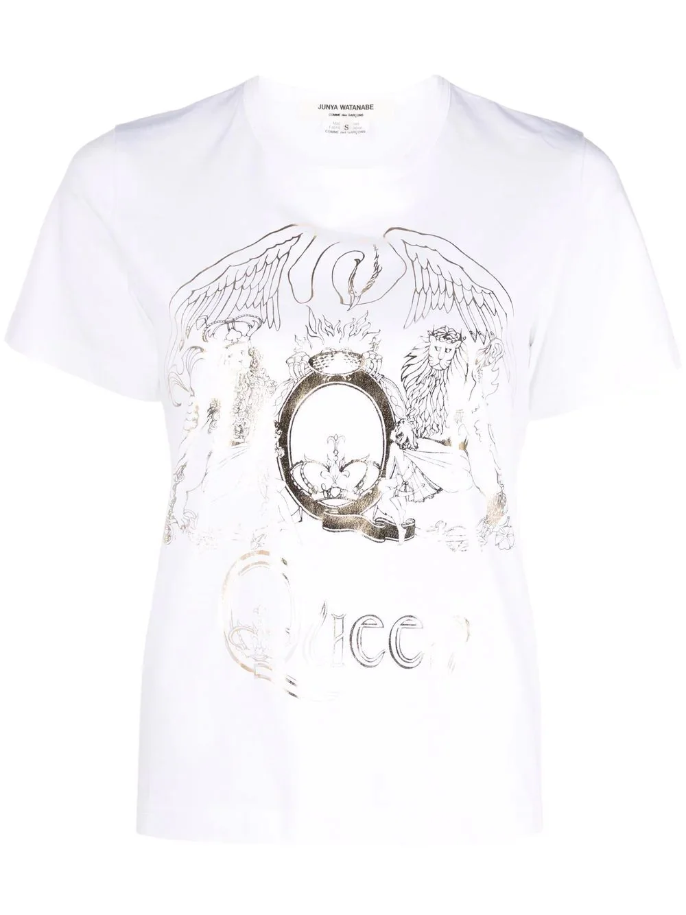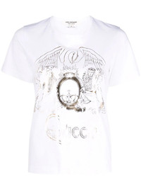graphic-print round-neck T-shirt white/gold cotton all-over graphic print crew neck short sleeves straight hem Imported Composition Cotton 100% SIZE & FIT Model measurements Height 5 ft 10 in(1.77 m) Bust/Chest 29.92 in(76 cm) Hips 34.25 in(87 cm) Waist 23.62 in(60 cm) FittingInformation This piece fits true to size. We recommend you get your regular size Cut for a relaxed fit Made with a mid-weight fabric Washing instructions Hand Wash
