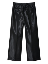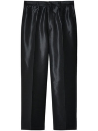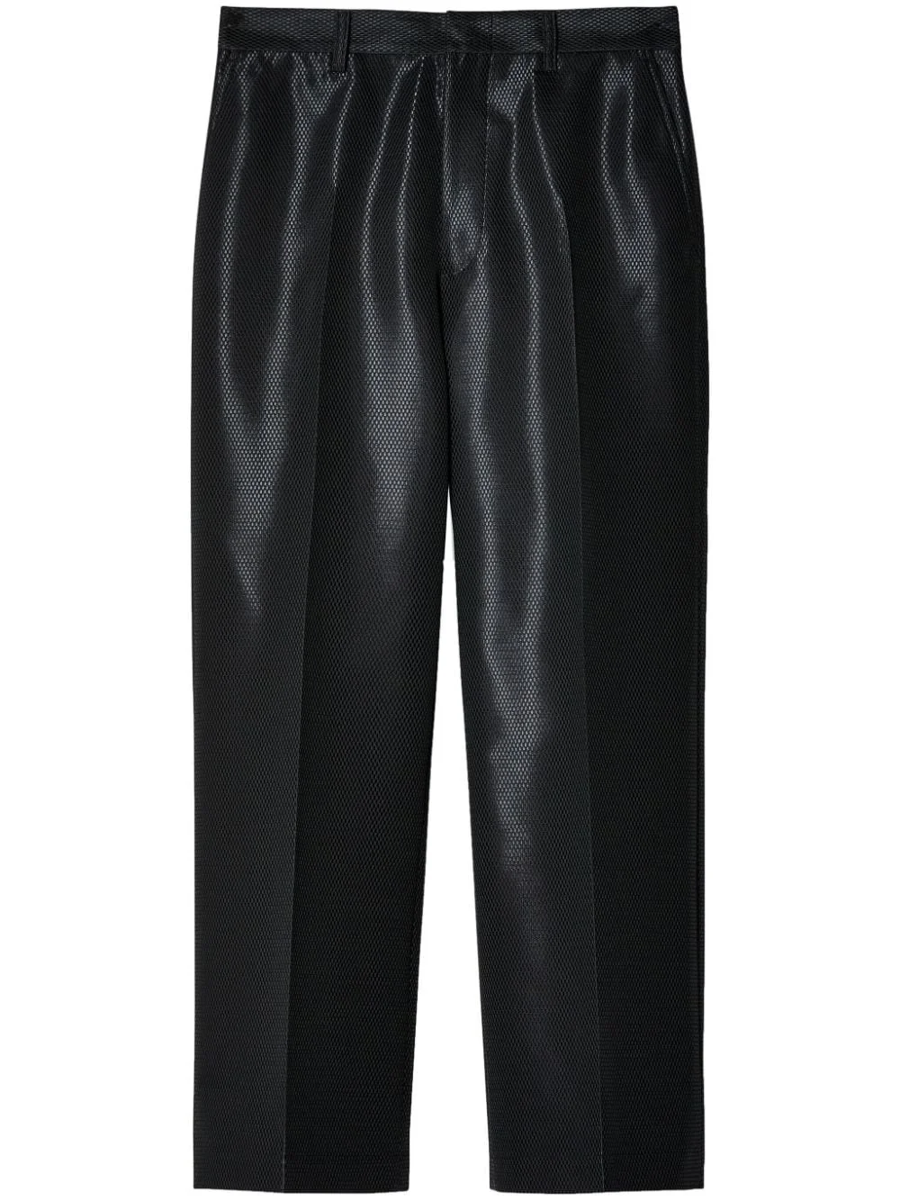 high-shine tailored trousers Highlights - Black - Textured finish - High-shine finish - Pressed crease - High-waisted - Concealed front fastening - Belt loops - Tailored cut - Two side slit pockets - Two rear button-fastening jetted pockets Imported Composition Polyester 100%