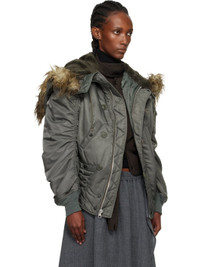 Insulated nylon twill bomber jacket. · Faux-fur trim, drawstring, and zip vent at hood · Stand collar · Zip closure with button placket · Welt pockets at front · Rib-knit hem and cuffs · Utility pocket at sleeve · Fully lined Supplier color: Sage green Body: 100% nylon. Trim 1: 55% acrylic, 45% polyester. Trim 2: 100% acrylic. Trim 3: 100% polyester. Trim 3: 100% modacrylic. Trim 4: 100% wool. Fill: 100% polyester. Lining: 100% nylon. Made in Japan 252253F058000