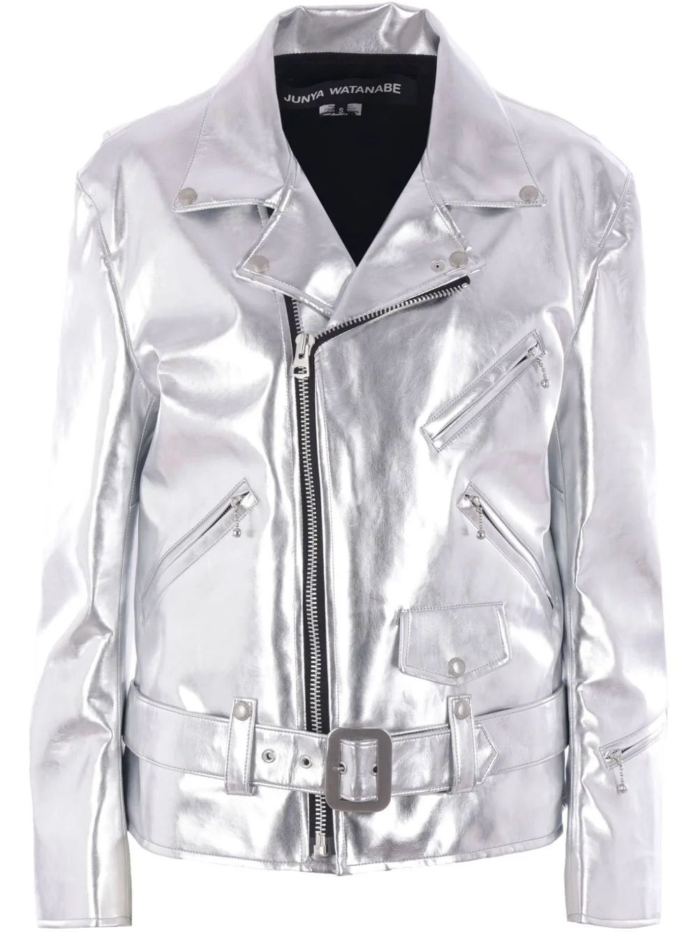 metallic biker jacket Highlights - Silver-tone - Metallic - Off-centre front zip fastening - Long sleeves Imported Composition Lining: Polyester 100% Outer: Artificial Leather 100%