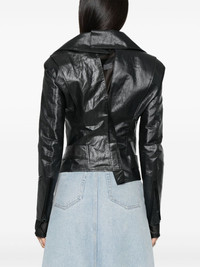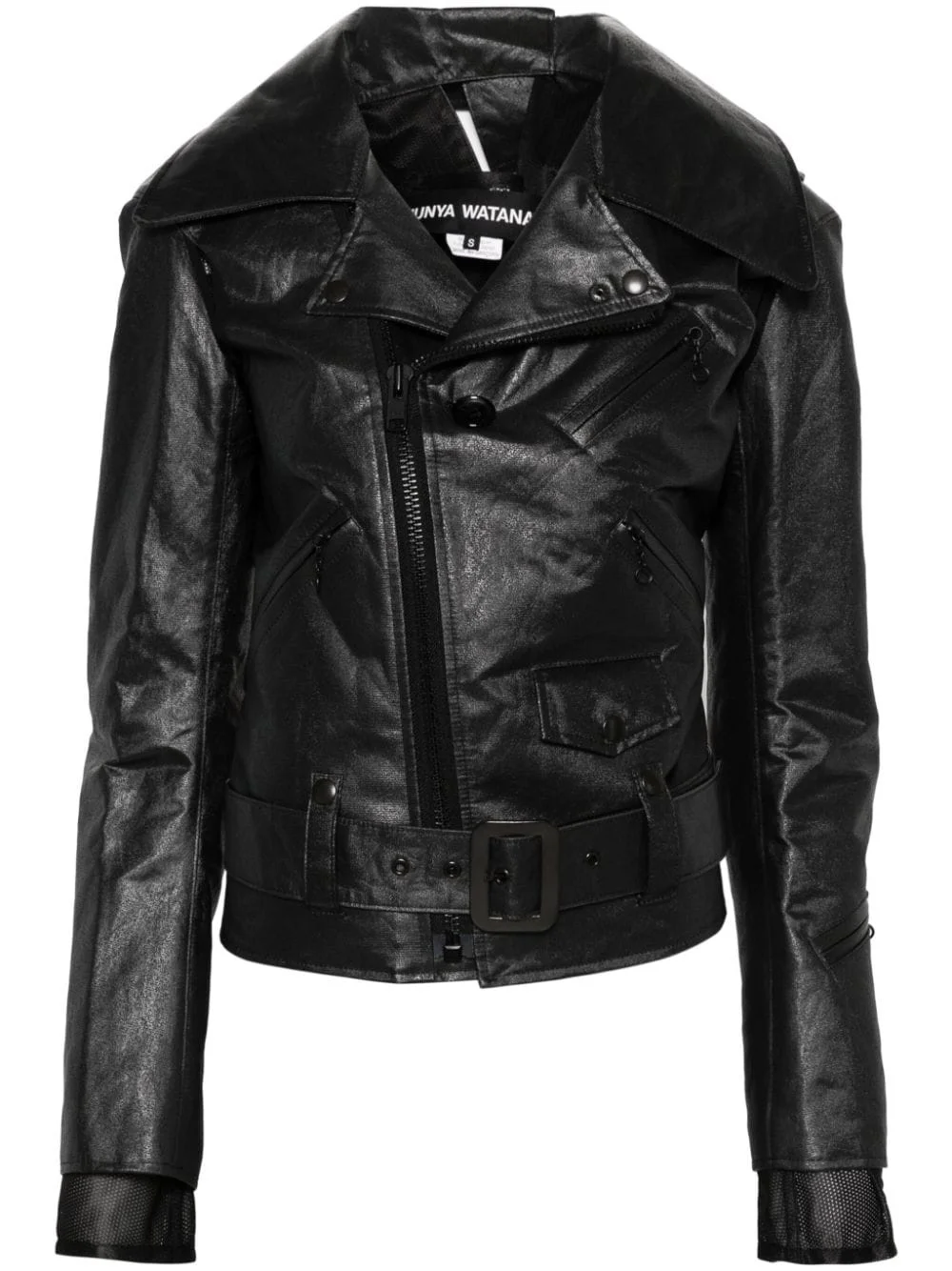 metallic biker jacquet Highlights - Black - Coated finish - Metallic effect - Spread collar - Zip-fastening chest pocket - Long sleeves - Cuff zips - Layered details to the cuff - Two side zip-fastening pockets - Front patch pocket - Belt loops - Detachable waist belt - Central rear vent with mesh panelling - Mesh lining - Off-centre front button fastening Imported Composition Lining: Polyester 100% Outer: Polyester 64%, Cotton 36% SIZE & FIT Model measurements Height 5 ft 11 in(1.8 m) Bust/Chest 33.07 in(84 cm) Hips 37.4 in(95 cm) Waist 25.19 in(64 cm) FittingInformation Designed for a slim fit that sits just away from the body offering a close yet comfortable fit The belt offers adjustability for fitted preferences Made from a midweight non-stretch fabric This piece fits true to size – take your usual size