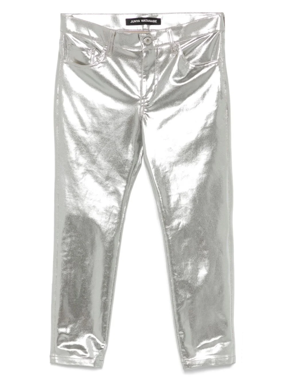 metallic trousers Highlights - Silver-tone - Concealed fly and button fastening - Belt loops - Classic five pockets Imported Composition Nylon 94%, Polyurethane 6% SIZE & FIT Model measurements Height 5 ft 9 in(1.76 m) Bust/Chest 31.88 in(81 cm) Hips 35.43 in(90 cm) Waist 24.8 in(63 cm) FittingInformation Designed for a slim fit, these trousers offer a close fit at the waist, allowing a comfortable close fit and some movement over the leg Cropped in length Made from a midweight non-stretch fabric, this piece offers minimal elasticity when worn