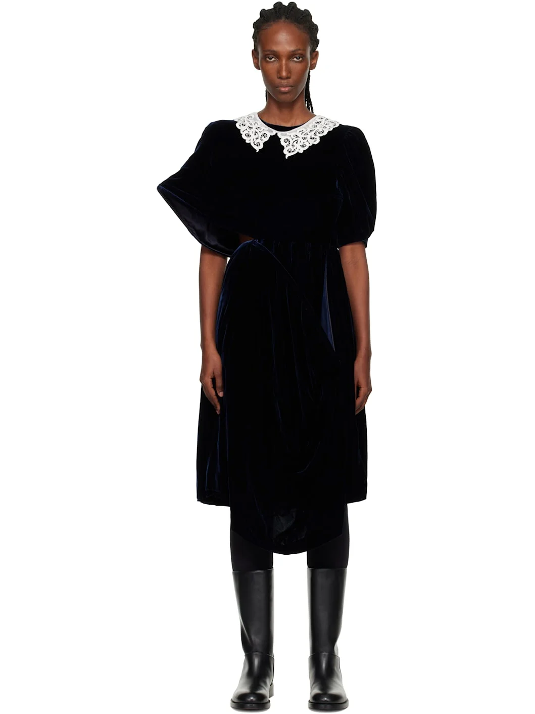 Velvet midi dress. · Lace trim at round neck · Boning at waist and sleeve · Pleats at waist · Asymmetrical sleeves · Full satin lining Supplier color: Navy/White Body: 65% rayon, 35% cupro. Lining: 100% cupro. Made in Japan 252253F054002