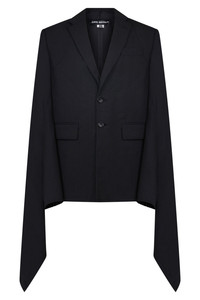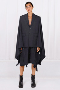 The Junya Watanabe Oversized Cape Sleeve Blazer is crafted from Mohair Stripe Wool mix/ This style features an exaggerated, wide frame and cascading cape-style sleeves, with exposed stitching to the front of the blazer. Fabrication: 76% Wool, 21% Mohair, 3% Polyester Size and Fit Lacey: Model is 180cm/5’11” and is wearing a size S Model Measurements: Bust: 86cm, Waist: 72cm, Hips 89cm Measurements Size XS: Bust: 92cm, Waist 92cm, Length 92cm Size S: Bust: 96cm, Waist 96cm, Length 96cm
