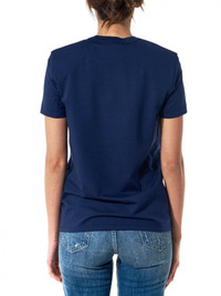 Navy Blue t-shirt featuring a frontal graphic print, a classic crewneck, padded shoulders, slim-fit sleeves, and tonal stitching throughout. 95% Cotton, 4% Polyurethane / Model wears a size S.