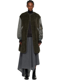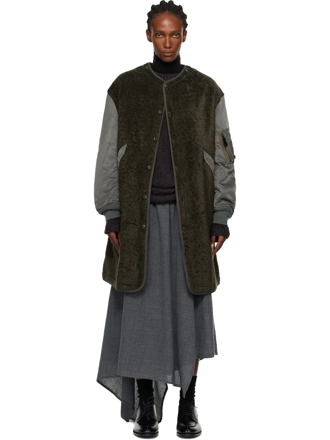 Insulated fleece and nylon twill bomber jacket. · Band collar · Button closure · Flap pockets at front · Utility pocket at sleeve · Rib-knit trim at cuffs and back · Full twill lining Supplier color: Khaki/Sage green Body 1: 55% acrylic, 45% polyester. Body 2: 100% nylon. Trim 1: 100% acrylic. Trim 2: 100% wool. Fill: 100% polyester. Lining: 100% polyester. Made in Japan 252253F058002
