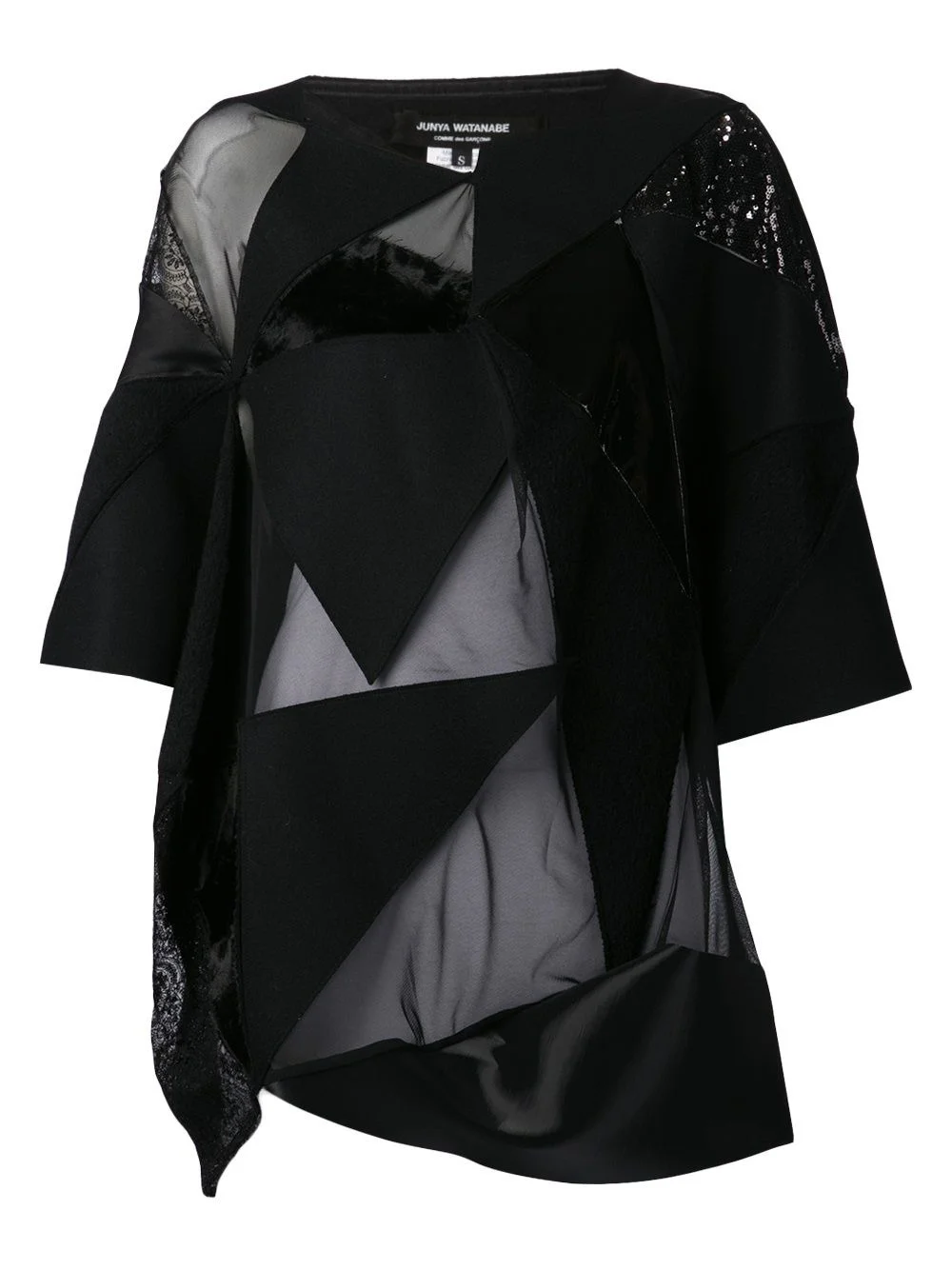 patchwork t-shirt Black wool blend patchwork t-shirt from Junya Watanabe featuring an asymmetric neckline, short sleeves and a long length. Imported Composition Polyester 100%, Wool 90%, Nylon 10% SIZE & FIT Model measurements Height 5 ft 10 in(1.78 m) Bust/Chest 31.88 in(81 cm) Hips 33.85 in(86 cm) Waist 25.19 in(64 cm) Washing instructions Dry Clean Only