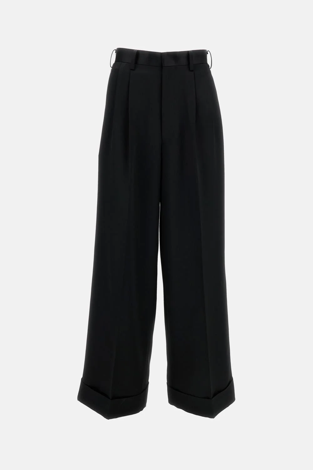 Tailored trousers with front pleats Fluid fabric, wide leg Turned-up hem Front closure with hidden zip and hook fastening Waist loops for a belt Side welt pockets Black color Details and Care Color: Nero Composition: 57% AC 43% WO Made in: Giappone Sku: JQP0250511