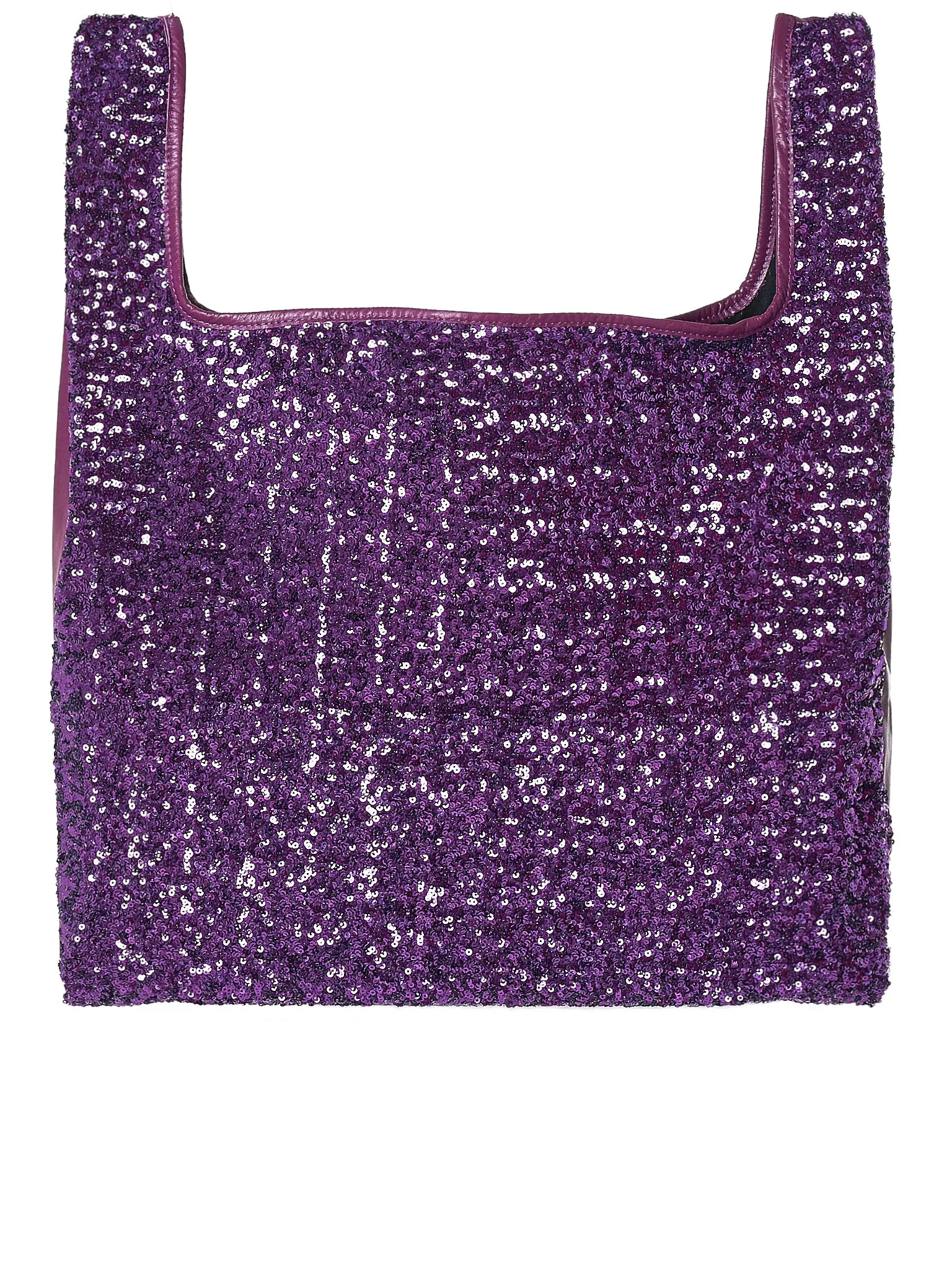 Junya Watanabe Comme des Garçons tote bag in purple, split sequined/leather faces, internal zip pocket, silver-tone hardware, tonal stitching. Made in Japan. Composition - 100% Polyester; 100% Leather (Partial) One size.