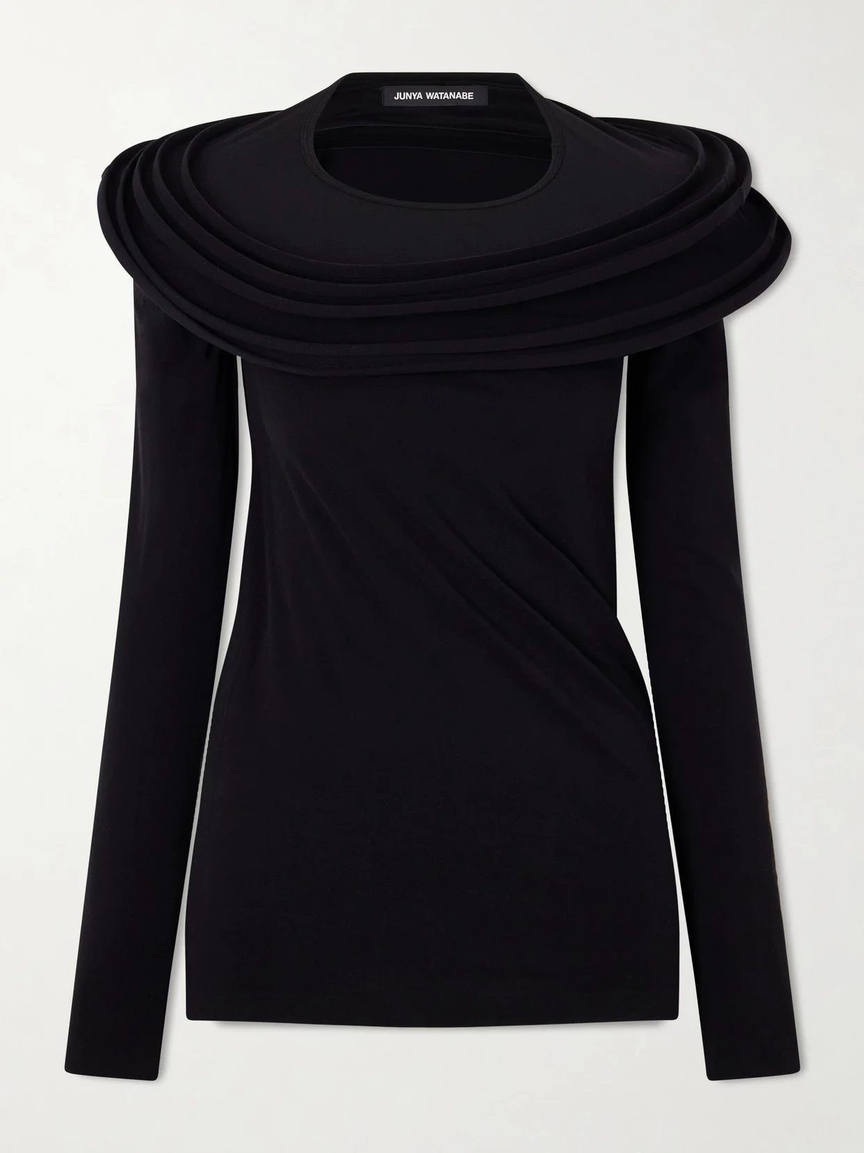 Junya Watanabe transforms wardrobe staples into architectural statements. Cut from stretch jersey in a slim, long-sleeved silhouette, this blouse is defined by a contemporary ruff collar composed of layered concentric circles. It brings a sculptural edge to even the simplest looks.