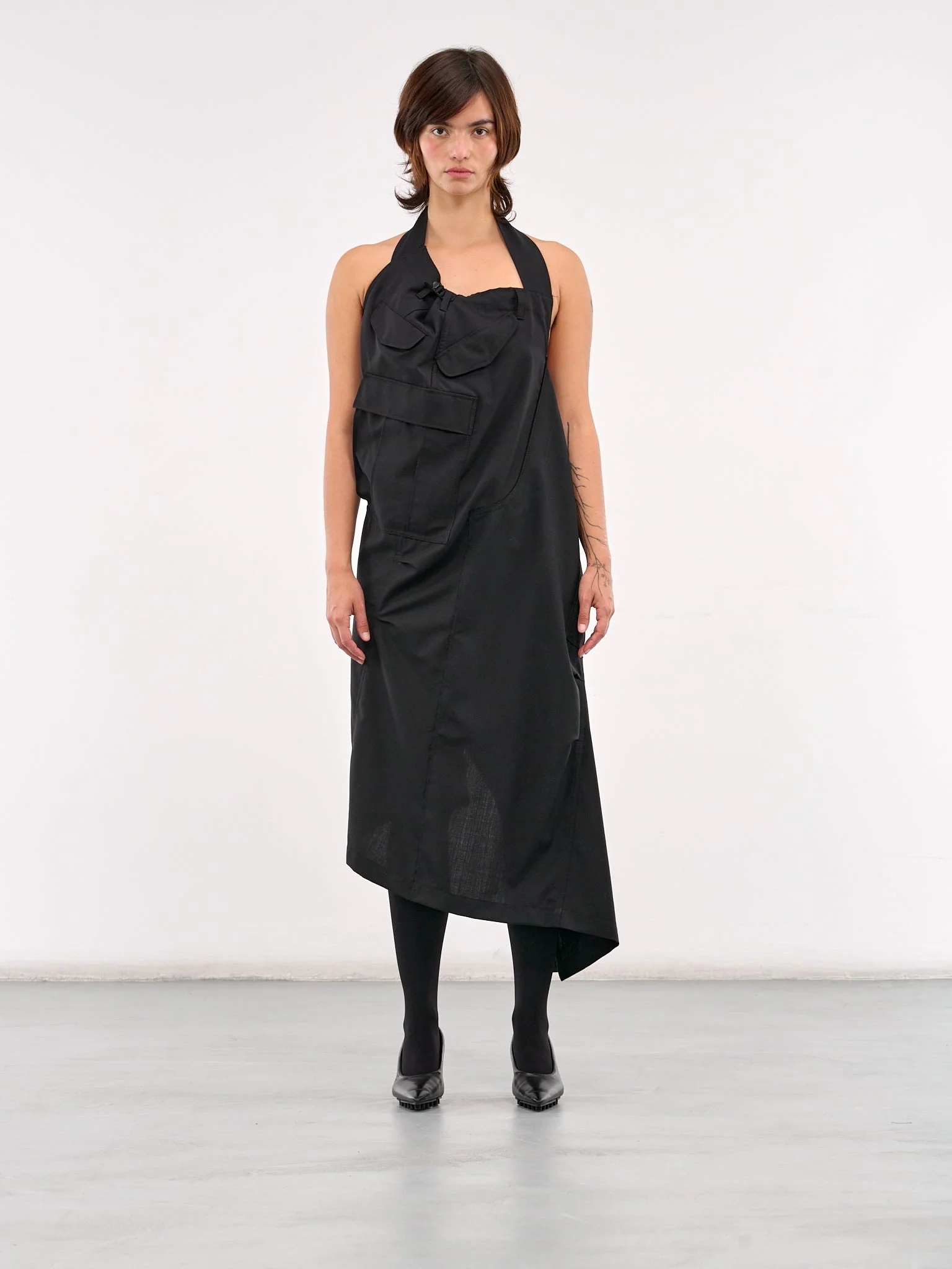JUNYA WATANABE dress in black, deconstructed dress design, paneled construction, halterneck, asymmetric neckline, sleeveless, armscyes, open back, front & back cargo pockets, twisted & deconstructed embellishment, back cinch strap, back vent, asymmetric hem, midi-length, slim fit. Standard Sizing Model is 5'7" wearing size S. Bust: 34" Waist: 26" Hips: 34"