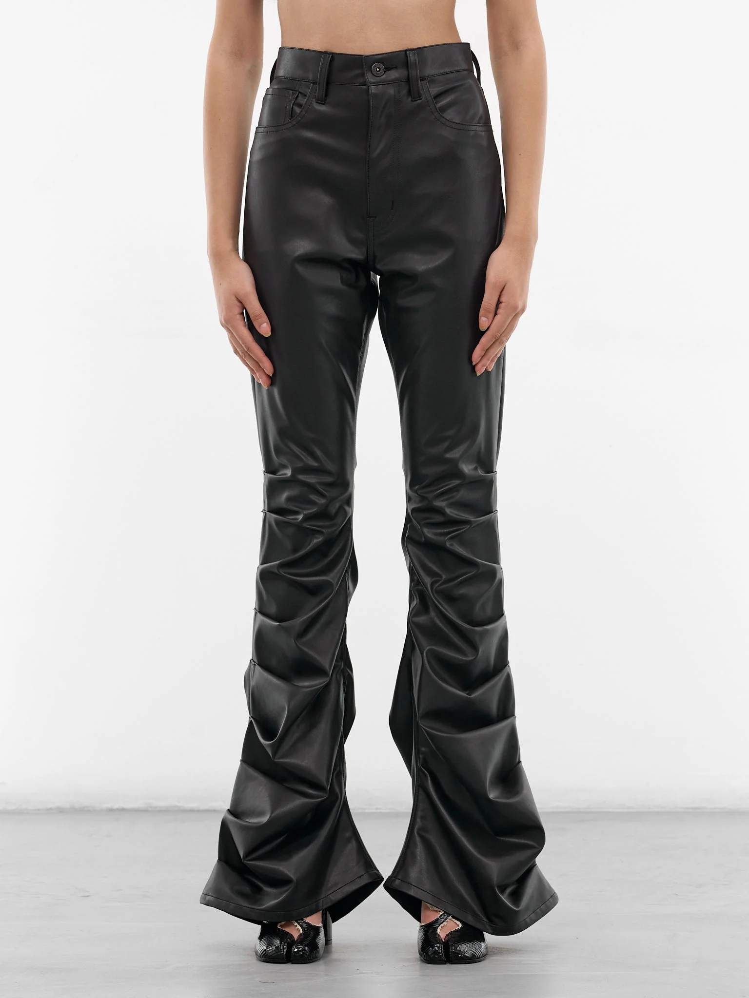 Pants in black constructed in vegan leather with pleating and draping through the flared leg. Featuring: • Slim fit • Vegan leather construction • High waist • Belt loops • Front button and zip fly • Five-pocket styling • Pleating and draping at leg • Flared leg • Made in Japan • 100% Polyester • Standard sizing Model is 5'7" wearing size S. Bust: 32.5" Waist: 24" Hips: 32"
