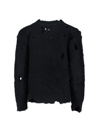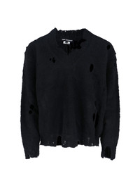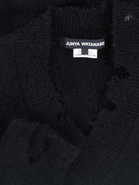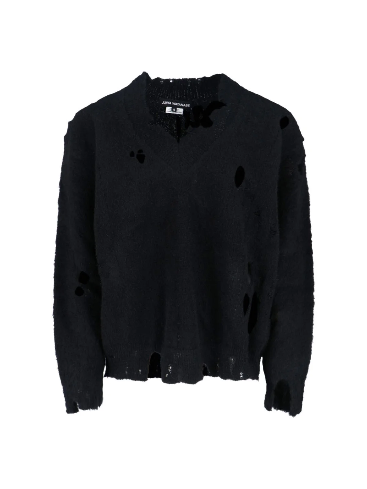 JUNYA WATANABE BLACK WOOL BLEND SWEATER WITH DESTROYED EFFECT, V-NECK, DROPPED SHOULDERS, RIBBED TRIM, STRAIGHT HEM. PRODUCT INFO PRODUCT CODE JP N008 W251 COMPOSITION: 86% WOOL, 14% POLYESTER SIZE AND FIT: OVERSIZED FIT MADE IN: JAPAN