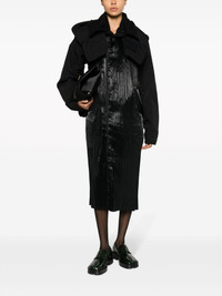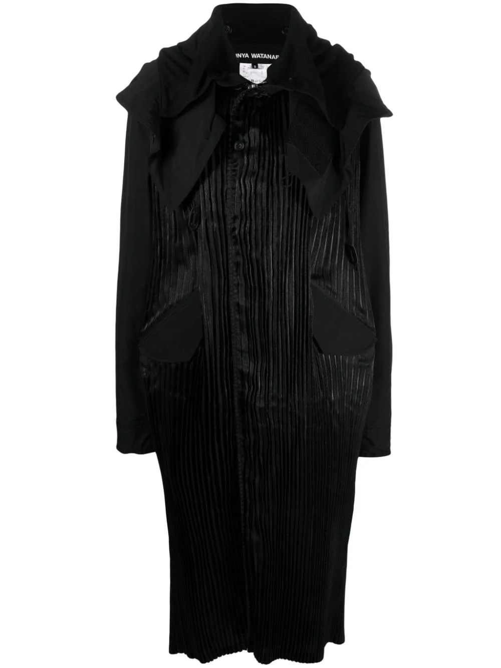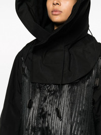 zip-up hooded jacket Highlights - Black - Classic hood - Front button fastening - Two front flap pockets - Long sleeves - Buttoned cuffs - Long length Imported Composition Outer: Polyester 60%, Nylon 40% Lining: Polyester 100%, Wool 100% SIZE & FIT Model measurements Height 5 ft 9 in(1.76 m) Bust/Chest 31.88 in(81 cm) Hips 35.43 in(90 cm) Waist 24.8 in(63 cm) FittingInformation Designed to be unstructured, offering a loose fit throughout The adjustable drawstring means that you can adjust this piece’s fit to suit your comfort and preference The pleated construction on this piece allows for additional movement and flexibility in the fit This piece fits true to size – take your usual size Washing instructions Dry Clean Only
