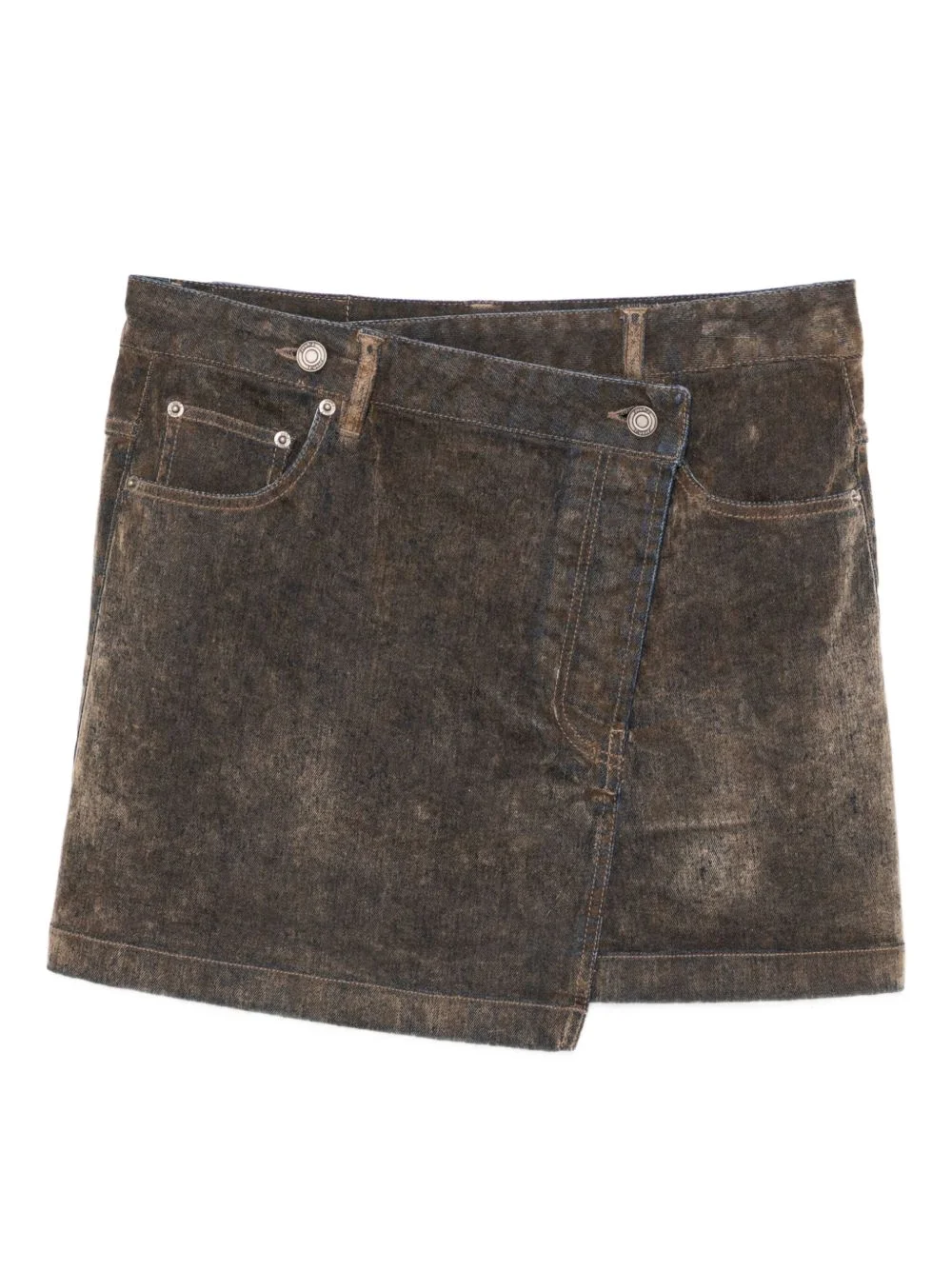 asymmetric denim skirt Highlights - Dark brown - Button fly fastening - Wrap design - Classic five pockets Imported Composition Cotton 98%, Polyurethane 2% Washing instructions Dry Clean Only