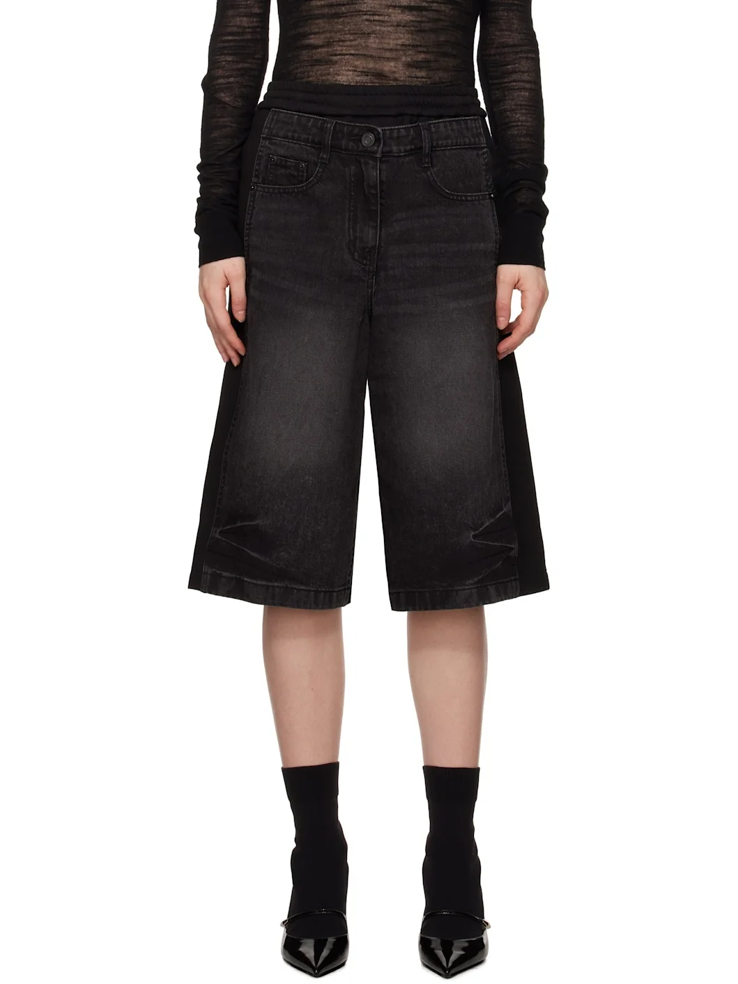 French terry and non-stretch denim shorts. Fading and whiskering throughout. · Paneled construction · Concealed drawstring at elasticized waistband · Belt loops · Five-pocket styling · Zip fly · Logo flag at back pocket Supplier color: Black 100% cotton. Made in South Korea 242343F088000