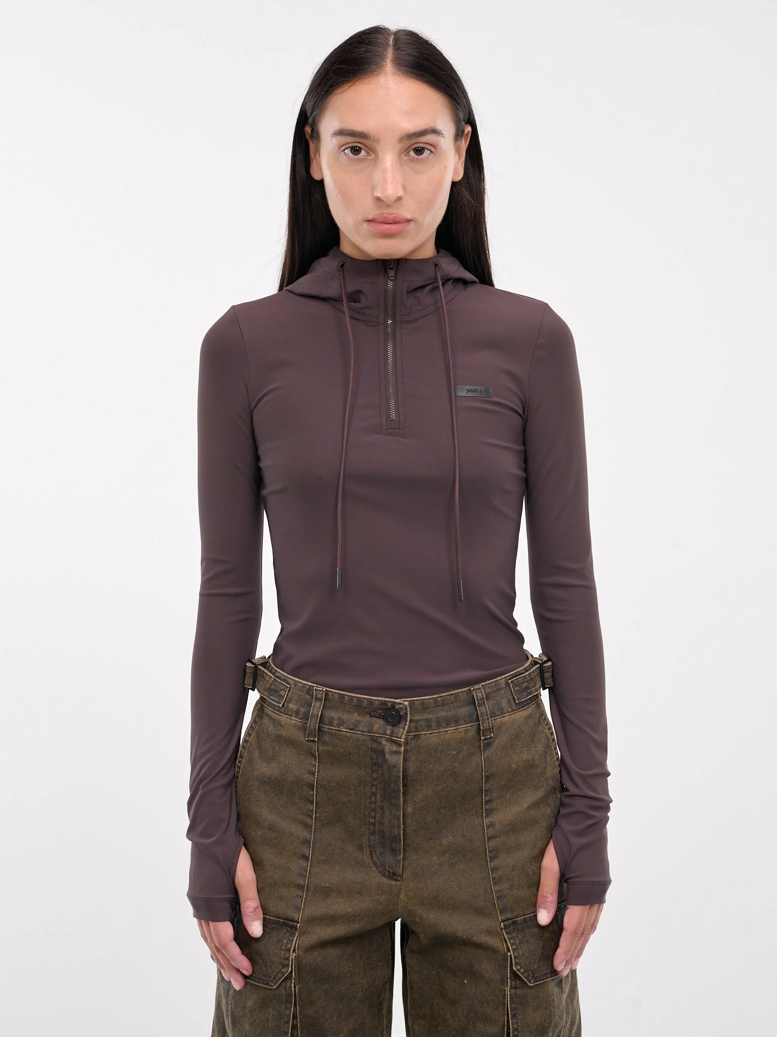 JUUN.J hoodie in brown, nylon-poly blend, paneled construction, hood, adjustable drawstring, front quarter zip closure, chest logo patch, long sleeves, back cut-outs, straight hem, slim fit. Made in Korea 84% Nylon 16% Polyurethane French Sizing Model is 5'6" wearing size 34. Bust: 31" Waist: 24" Hips: 34"