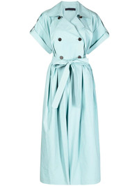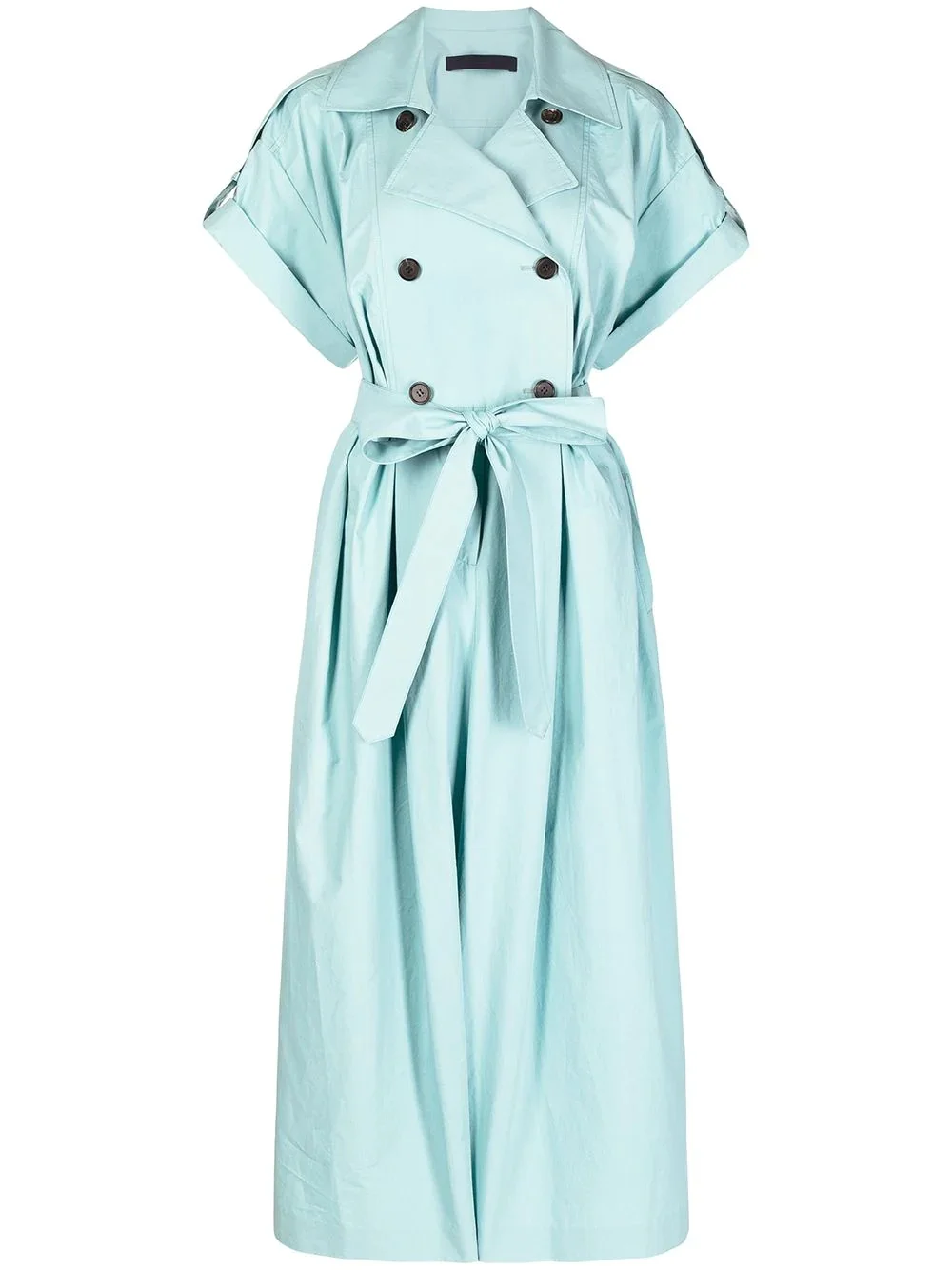 double-breasted trench jumpsuit blue cotton double-breasted button fastening short sleeves wide notch lapels short sleeves tied waist wide leg cropped leg Imported Composition Cotton 100% SIZE & FIT Model measurements Height 5 ft 11 in(1.8 m) Bust/Chest 28.34 in(72 cm) Hips 35.43 in(90 cm) Waist 23.62 in(60 cm) FittingInformation This piece fits true to size. We recommend you get your regular size Designed for a loose fit with a close fit at the waist Made with a mid-weight fabric Washing instructions Dry Clean Only