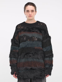 JUUN.J black sweater, oversized silhouette, knit construction, faux-fur stripes, distressed detailing, crewneck, drop shoulder, ribbed trim, relaxed fit. One Size Model is 5'11" wearing size OS. Bust: 32" Waist: 24" Hips: 34"